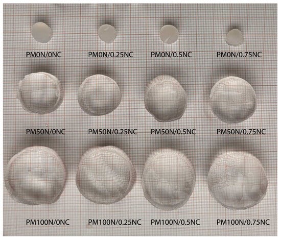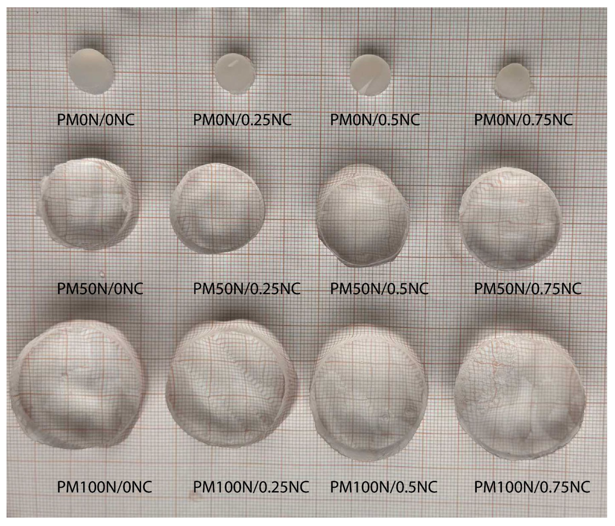 Table 6) was added under continuous stirring. The mass fraction (wt.%) of NC was calculated based on the dry matter content of the final mixture. Then, 2.5 g of a 4% (