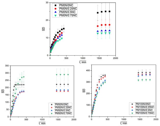 4.5. Swelling of PM0N, PM50N and PM100N Hydrogels