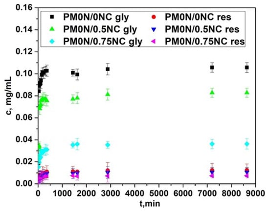 The release profiles of both active compounds were affected by the presence of NC in the PM0N/xNC hydrogels. As seen in