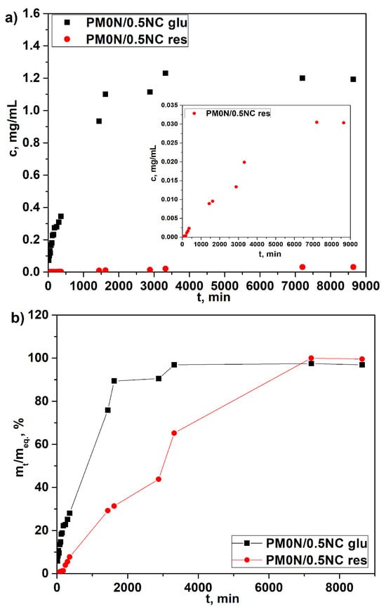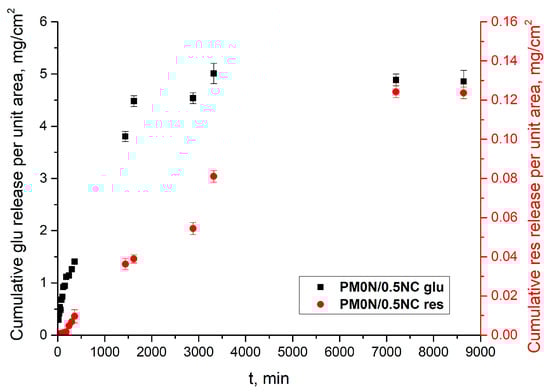 Figure 10a, the concentration of released N-acetyl glucosamine reached its maximum after 48 h. The concentrations of released resveratrol were much lower due to its low solubility in water, which hindered diffusion. To compare the release rates of two active substances, the release data are presented in