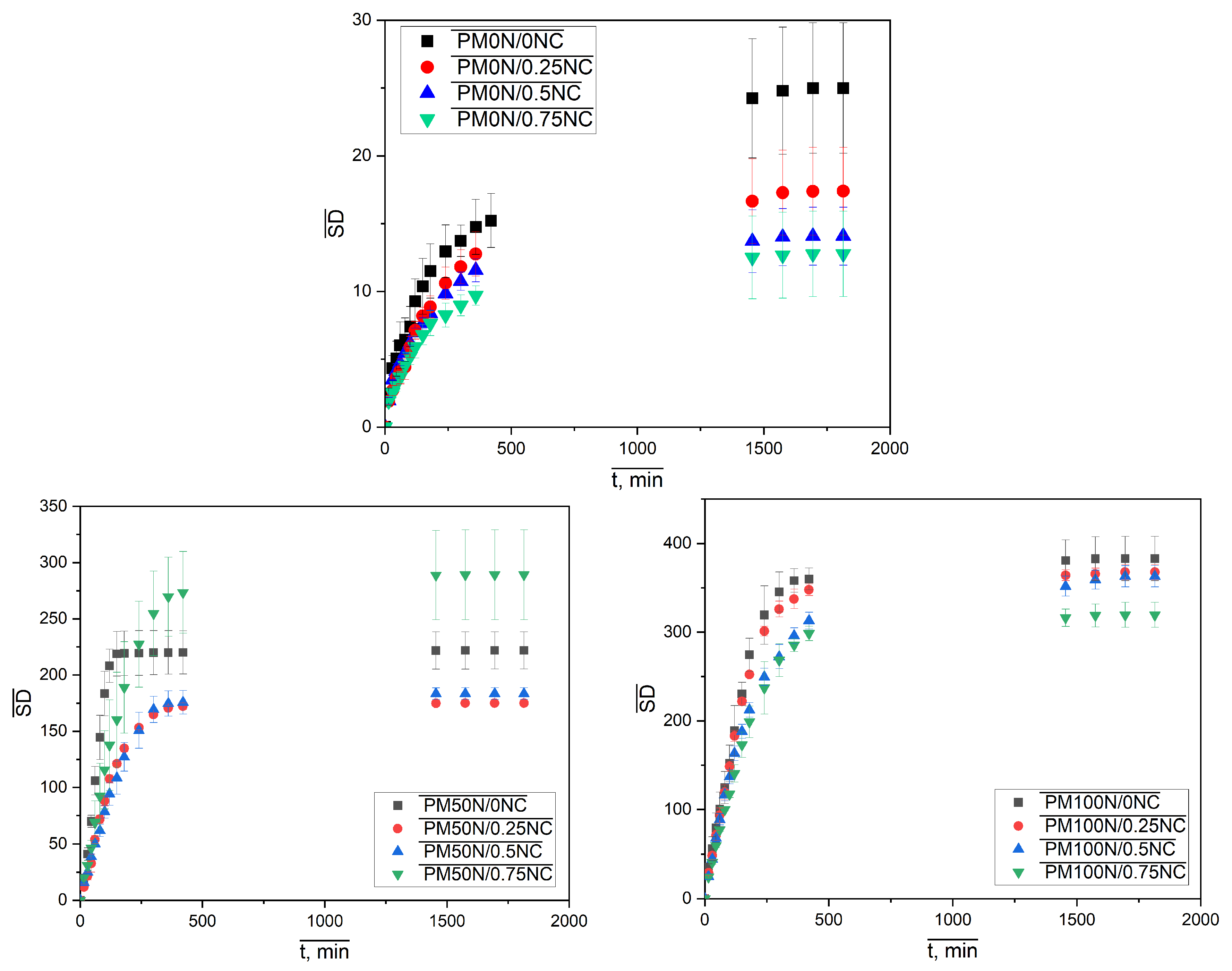 Since the PM50N/xNC and PM100N/xNC series were mechanically unstable at higher percentages of strain, further testing was accomplished with the PM0N/xNC series of samples that showed optimal mechanical properties and swelling behavior.