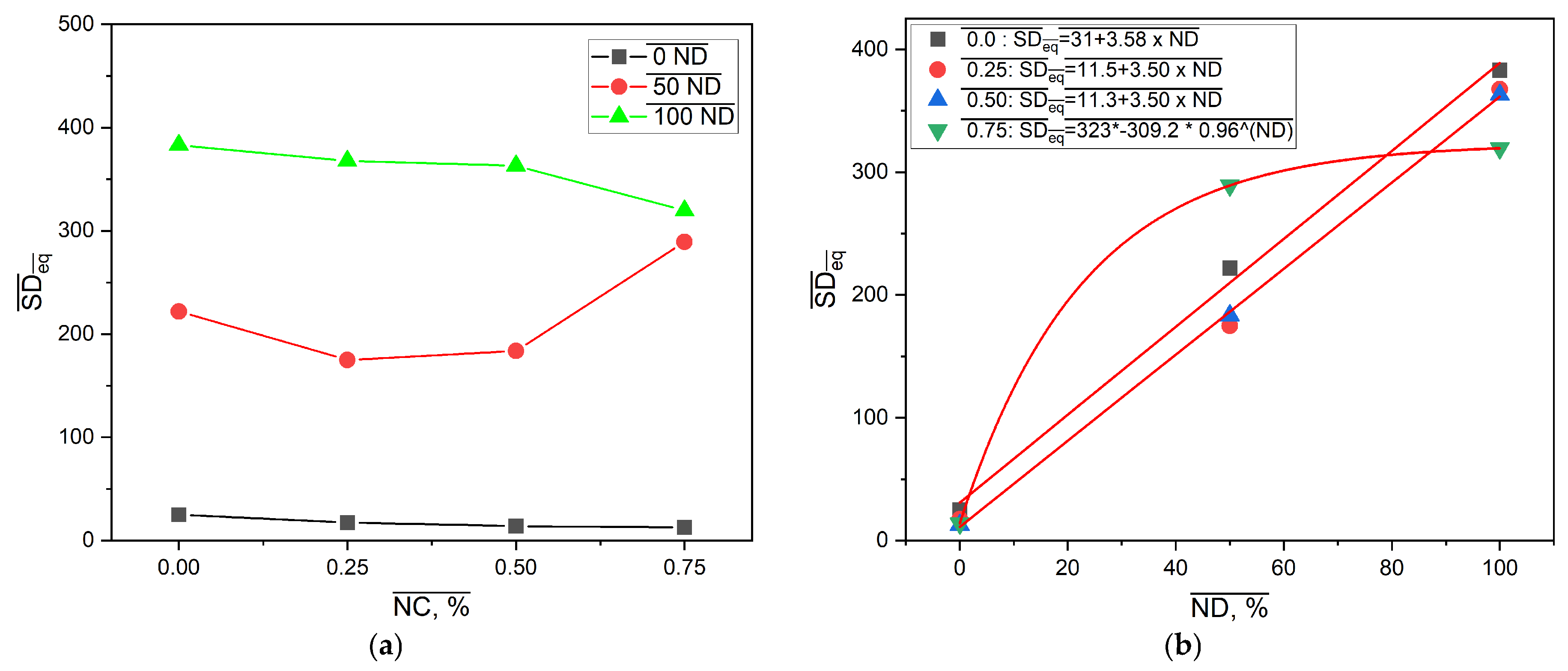 Table 2 show that the addition of NC fibers led to improvement in mechanical properties. With an increase in the NC mass fraction up to 0.5%, the compressive strength of the PM0N/xNC sample series increased in all compression cycles. However, with a further increase in NC content to 0.75%, a decrease in compressive strength of the PM0N/xNC series was observed, indicating a deterioration of mechanical integrity likely due to excessive filler content causing aggregation or matrix disruption. Furthermore, with the rising the percentage of strain (from 10 to 60%), the compressive strength values of the PM0N/xNC sample series also increased, suggesting that the samples offer greater resistance to the applied external compressive force at the higher value of the strain, likely due to densification and structural compaction mechanisms becoming more dominant at elevated deformations.
