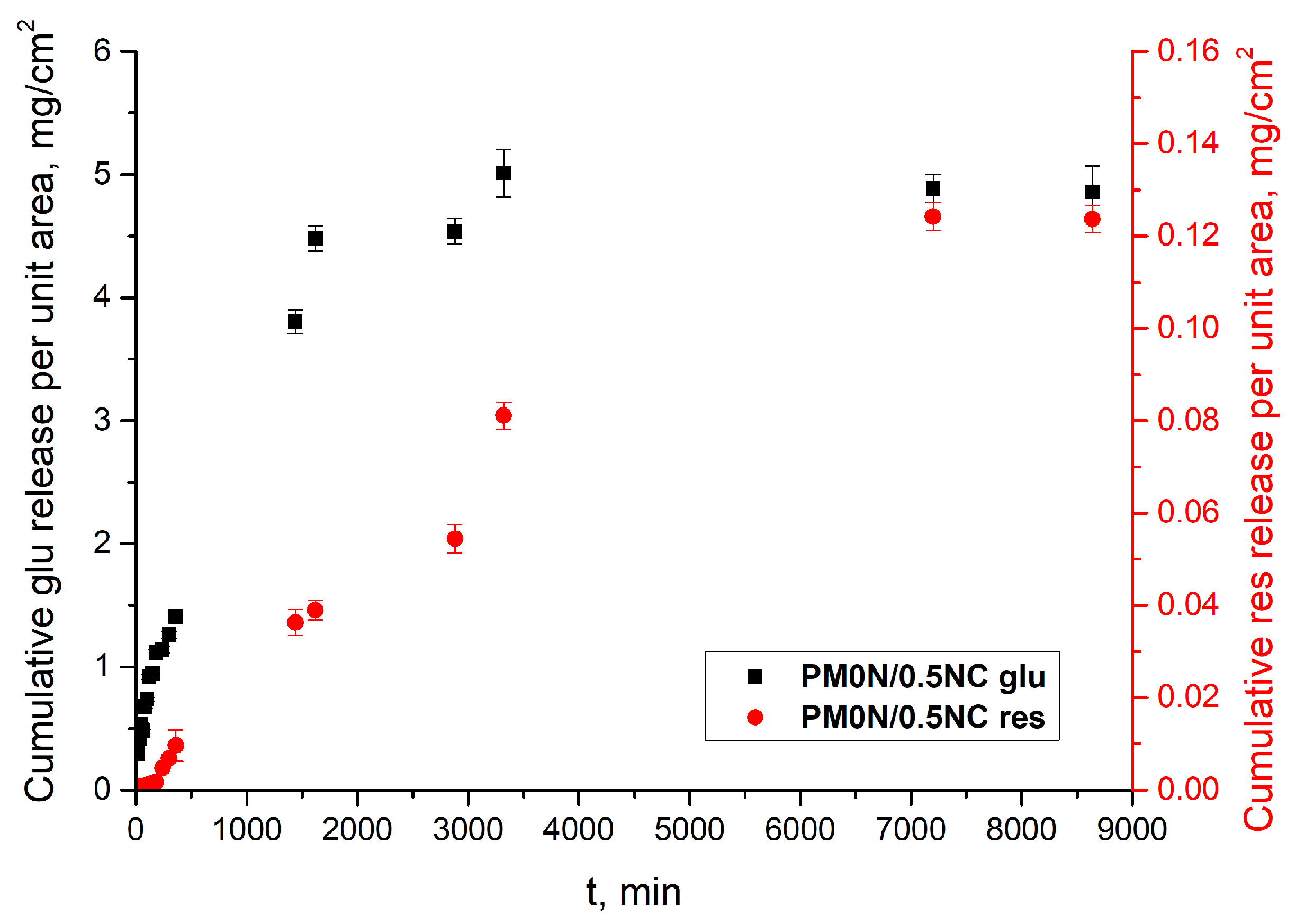 33]. This approach can enhance bioavailability of the active substances and prolong their release time, thereby extending their therapeutic effect. Additionally, encapsulation of the active substance in hydrogels allows for controlled release kinetics, meaning that a specific therapeutic dose is released over a longer period of time in a controlled manner. Controlling the release kinetics of the active substance from the hydrogel dressing is a crucial factor for effective and safe wound treatment. Hence, to investigate the possibility of using PM0N/xNC hydrogels for controlled and prolonged release of active substances with wound-healing potential, resveratrol and N-acetyl glucosamine were encapsulated in the PM0N/xNC hydrogels. PM0N/xNC hydrogels were selected to evaluate the controlled release of active substances due to their optimal swelling behavior and mechanical properties. It is well known that resveratrol exhibits significant anti-inflammatory properties and supports skin barrier function by modulating cytokine expression and promoting keratinocyte [