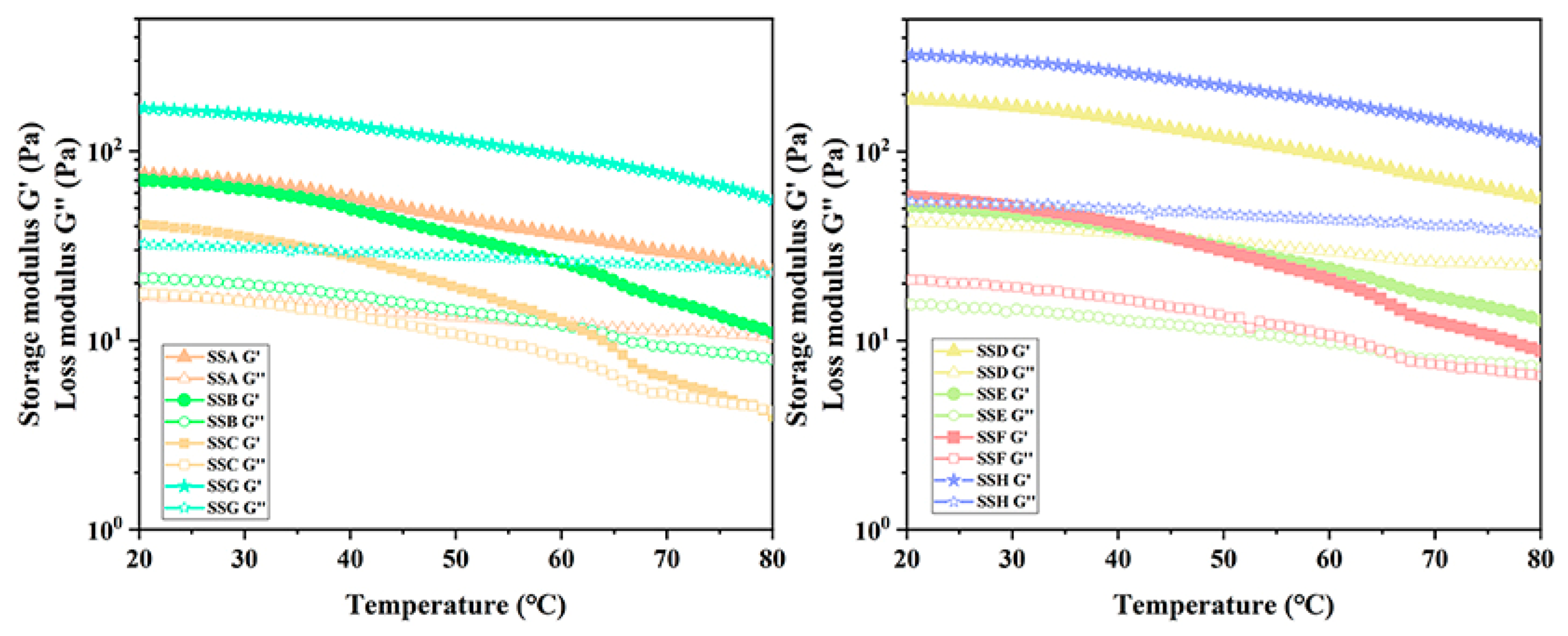 - Zhang, G.; Cheng, P.; Chu, L.; Zhang, H.; Wang, C.; Shi, R.; Wang, Z.; Han, J.; Fan, Z. Unveiling the rheological and thermal behavior of a novel Salecan and whey protein isolate composite gel. Int. J. Biol. Macromol. 2024, 271, 132528. [Google Scholar] [CrossRef] [PubMed]