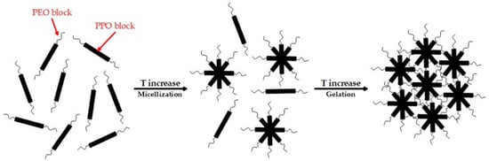 Based on the specific temperature range of the sol-to-gel transition (27–31 °C), P407 was chosen as the main gelling agent. Moreover, according to the literature, P407 is the least toxic of the commercially available poloxamers [41,42,43]. P407 is an amphiphilic block copolymer consisting of a central hydrophobic block of PPO surrounded by two hydrophilic blocks of PEO [44]. At temperatures below the sol-to-gel transition point (Tsol–gel), P407 molecules exist primarily as monomers or loosely bound aggregates in solution, resulting in a low-viscosity liquid state of the system (sol). An increase in temperature causes dehydration of the hydrophobic PPO blocks, initiating the self-assembly of P407 molecules into micelles with a hydrophobic PPO core and a hydrophilic PEO shell [45]. With a further increase in temperature and a sufficient polymer concentration, these micelles are tightly packed and arranged into ordered structures [46]. This process leads to the formation of a three-dimensional network, which causes the system to transition to a gel state (Figure 1).