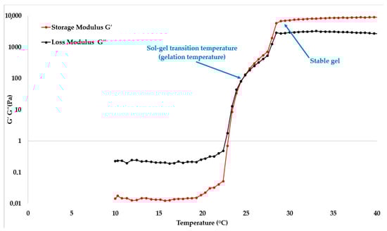To determine the Tsol–gel, graphs of the storage modulus (G′) and loss modulus (G″) versus temperature were constructed for each sample. The storage modulus is proportional to the energy stored and returned during vibrations, while the loss modulus is proportional to the energy lost due to friction [47]. Therefore, in predominantly elastic solids, G′ > G″, and in viscous liquids, G″ > G′. The Tsol–gel can be defined as the intersection point of G′ and G″ (Figure 2).