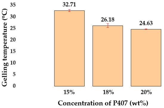 Based on the experimental results obtained, a pronounced dependence of the Tsol–gel on concentration was revealed: with an increase in the content of P407, a decrease in the Tsol–gel was observed from 32.71 ± 0.47 °C to 24.63 ± 0.14 °C (Figure 4). The obtained Tsol–gel of the P407 solutions are consistent with the data of other researchers [21,48,49]