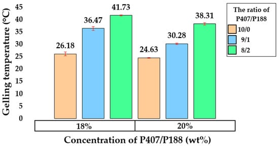 Many studies have demonstrated the dependence of the gelling properties of poloxamers on the ratio of hydrophobic PPO to hydrophilic PEO blocks in the polymer chain structure [59,60]. Based on the literature data, P188 is characterized by a higher PEO/PPO ratio compared with P407, which makes it a more hydrophilic polymer.