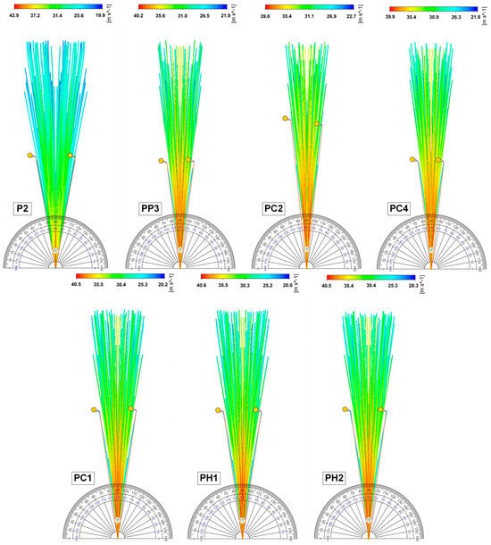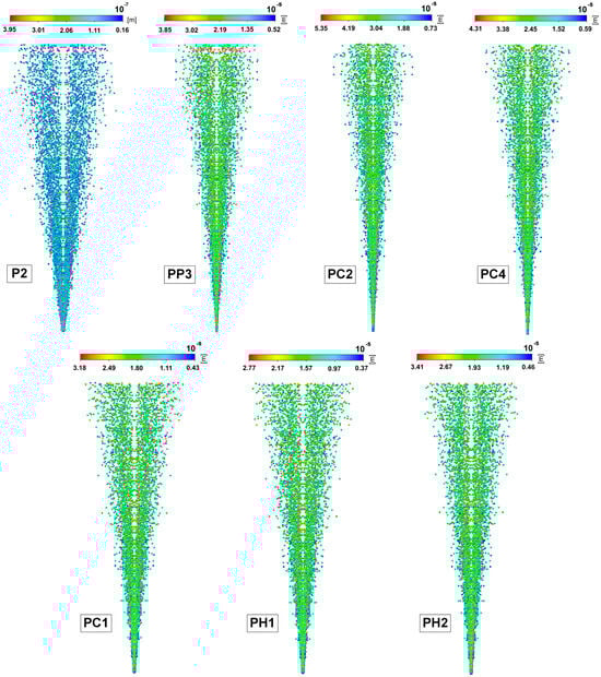 In this work, a series of computational experiments were carried out to predict the spray torch for the leading compositions: P2, PP3, PC1, PC2, PC4, PH1, and PH2 (Figure 7) using the mathematical model given in Section 4.7.