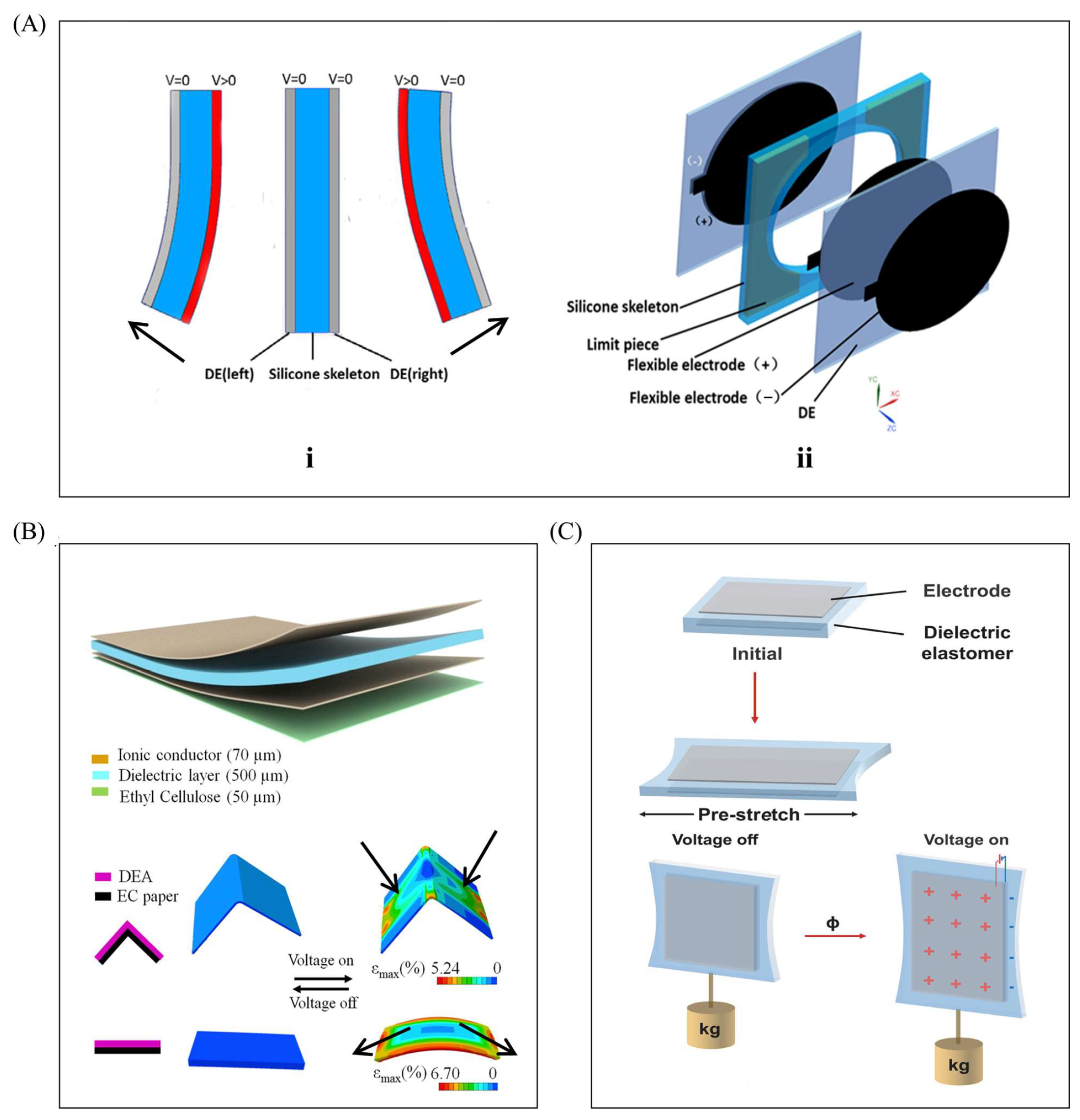 - Luo, K.; Wu, J.; Chen, F. Optimal biaxial prestretch ratios of soft dielectric elastomer actuators for maximal voltage-induced displacement. Sci. China Technol. Sci. 2023, 66, 2871–2881. [Google Scholar] [CrossRef]