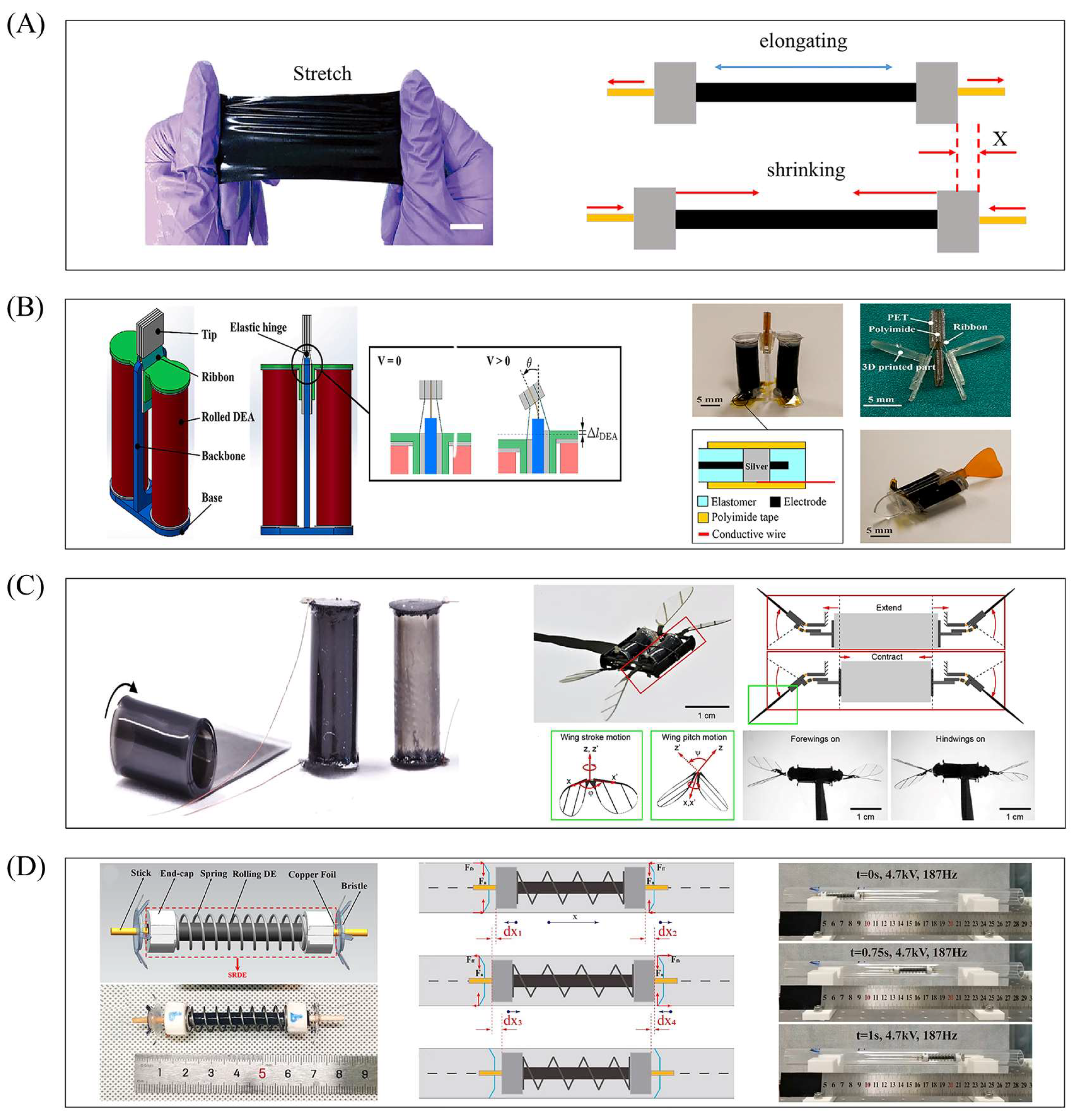 | DEAs | Maxwell’s stress effect | Millisecond level (10 ms–500 ms) | 1600% | Planar expansion, linear contraction, bending | [46,47,48] |