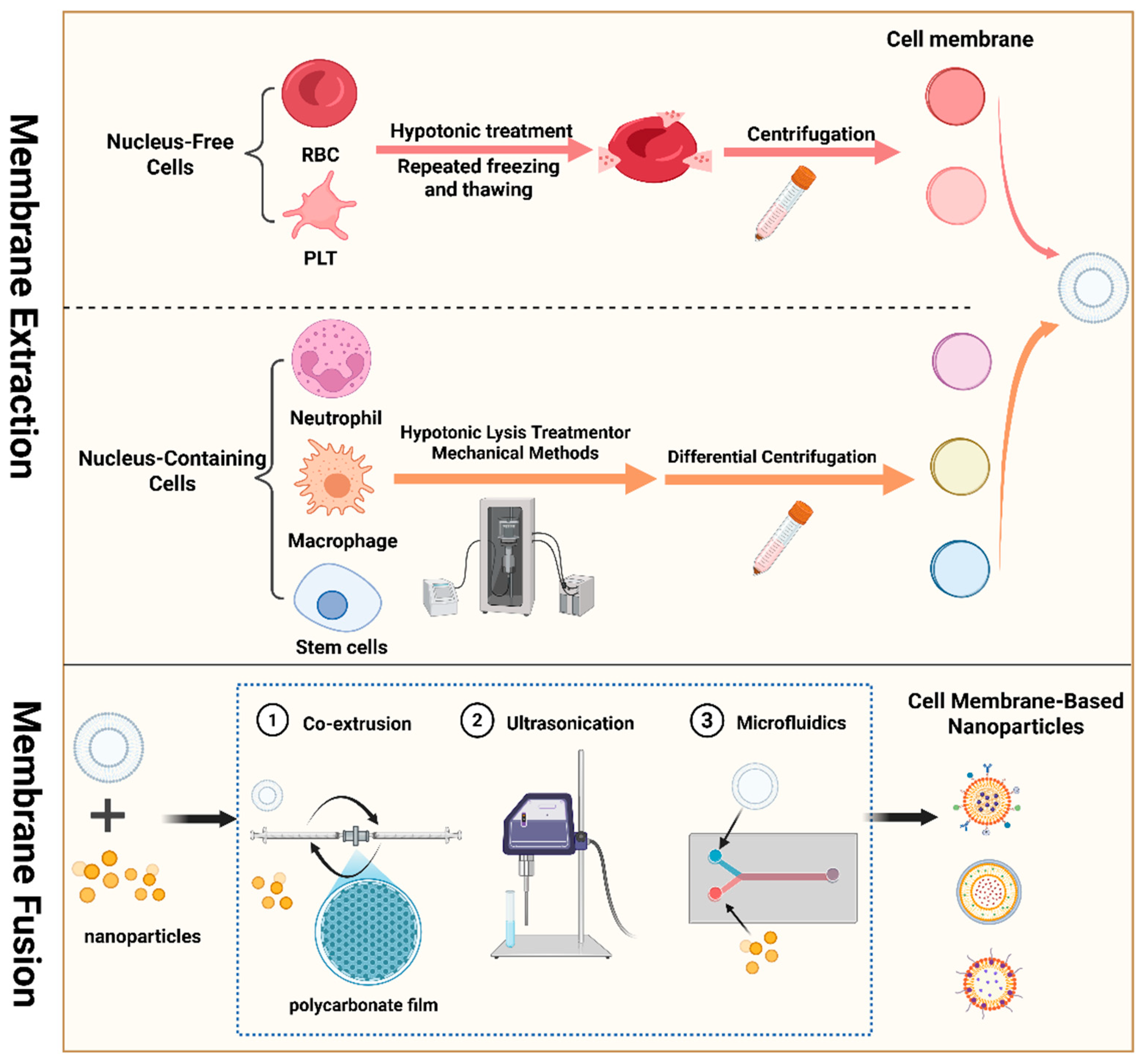 Figure 1. Processes of cell membrane extraction and membrane–nanocarrier fusion for constructing cell membrane-modified nanocarriers. For anucleate cells, cell membranes are obtained through hypotonic treatment, repeated freezing–thawing, and centrifugation. For nucleated cells, cell membranes are extracted by means of hypotonic lysis, mechanical methods (such as homogenization), and differential centrifugation to remove intracellular components. The extracted cell membranes are fused with nanoparticles via three core methods: co-extrusion, ultrasonication, and microfluidics. (Created in BioRender, Ding, F (2025) https://BioRender.com/17gkzfg).