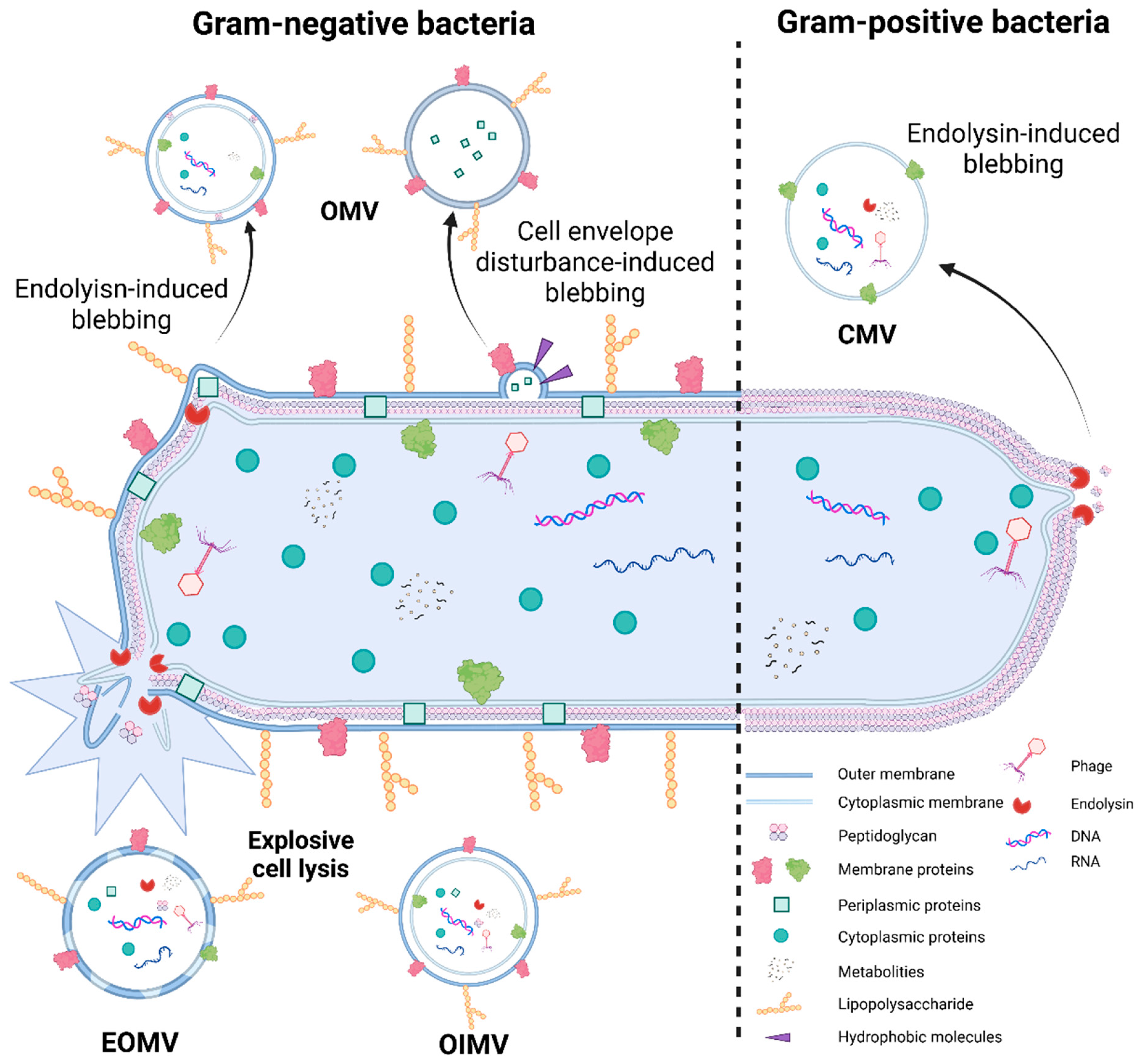 Figure 2. Mechanisms of bacterial extracellular vesicle (EV) formation in Gram-negative and Gram-positive bacteria. Gram-negative bacteria generate OIMVs and EOMVs via cell lysis and OMVs via outer membrane vesiculation. Gram-positive bacteria produce CMVs through endolysin-induced peptidoglycan breakdown, with vesicles containing cytoplasmic and membrane components (Created in BioRender, Ding, F (2025) https://BioRender.com/x9xa27x).