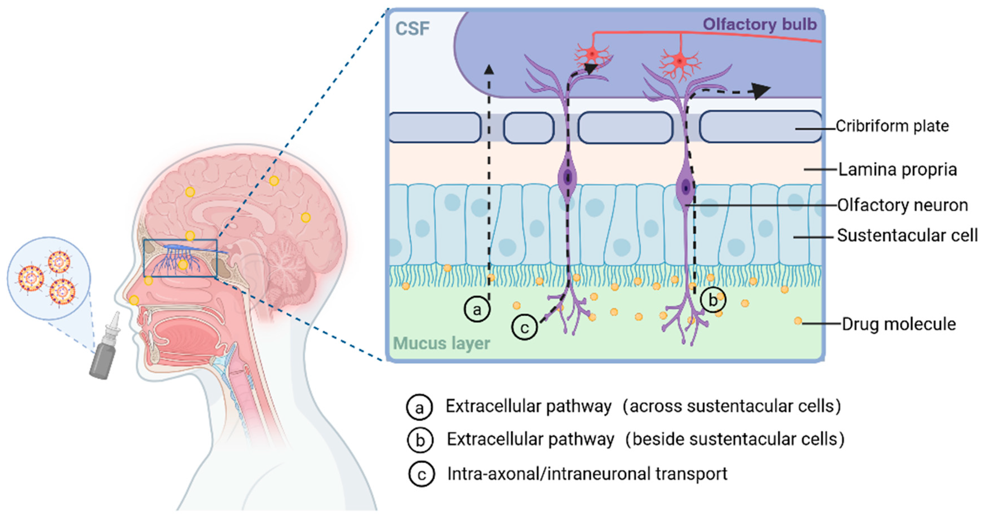 In recent years, intranasal drug delivery has proven to be a non-invasive approach that enables drugs to bypass the BBB and enter the CNS effectively [10,11,12]. Drugs can enter the brain and cerebrospinal fluid (CSF) through the nasal epithelium or across the axons of olfactory and trigeminal nerves [13]. Compared with systemic administration and topical application, intranasal drug delivery is increasingly attracting attention because of its advantages, such as convenience, low systemic exposure, rapid onset of action, and high bioavailability [14].