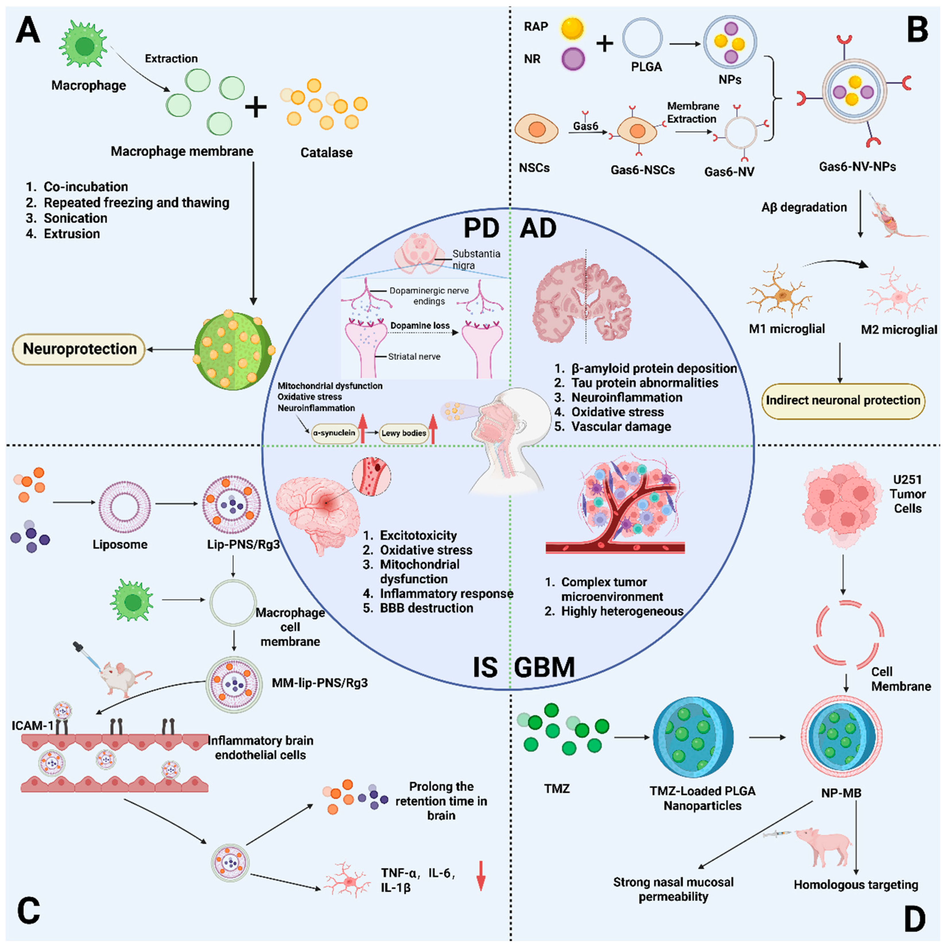 Figure 4. Application of cell membrane- and vesicle-based biomimetic nanodrugs in the nasoencephalic pathway for treating various neurological diseases. (A) Catalase-loaded exosomes, after intranasal administration, are internalized by neurons and microglia in PD mice, exerting significant neuroprotective effects. (B) The Gas6-NV-NPs system is formed by modifying poly(lactic-co-glycolic acid) (PLGA) nanoparticles co-encapsulating rapamycin (RAP) and nicotinamide riboside (NR) with membranes from neural stem cells overexpressing glial cell line-derived neurotrophic factor (GDNF). This system targets pathological regions of AD, not only enhancing the phagocytic clearance of β-amyloid (Aβ) by microglia but also regulating microglia to an anti-inflammatory phenotype, achieving brain targeting and neuronal repair. (C) Macrophage membrane-coated liposomes (MM-Lip-Rg3/PNS) loaded with ginsenoside Rg3 and total saponins, by virtue of the affinity of macrophage membrane proteins for inflamed cerebral microvascular endothelial cells, cross the BBB to exert neuroprotective effects, addressing inflammation and tissue damage after ischemia. (D) Poly(lactic-co-glycolic acid) (PLGA) nanoparticles loaded with temozolomide (TMZ) and coated with U251 glioma cell membranes (NP-MB), combined with the nasoencephalic drug delivery pathway, enhance the targeting to GBM cells, thereby achieving effective treatment (Created in BioRender, Ding, F (2025) https://BioRender.com/h1hyqty).