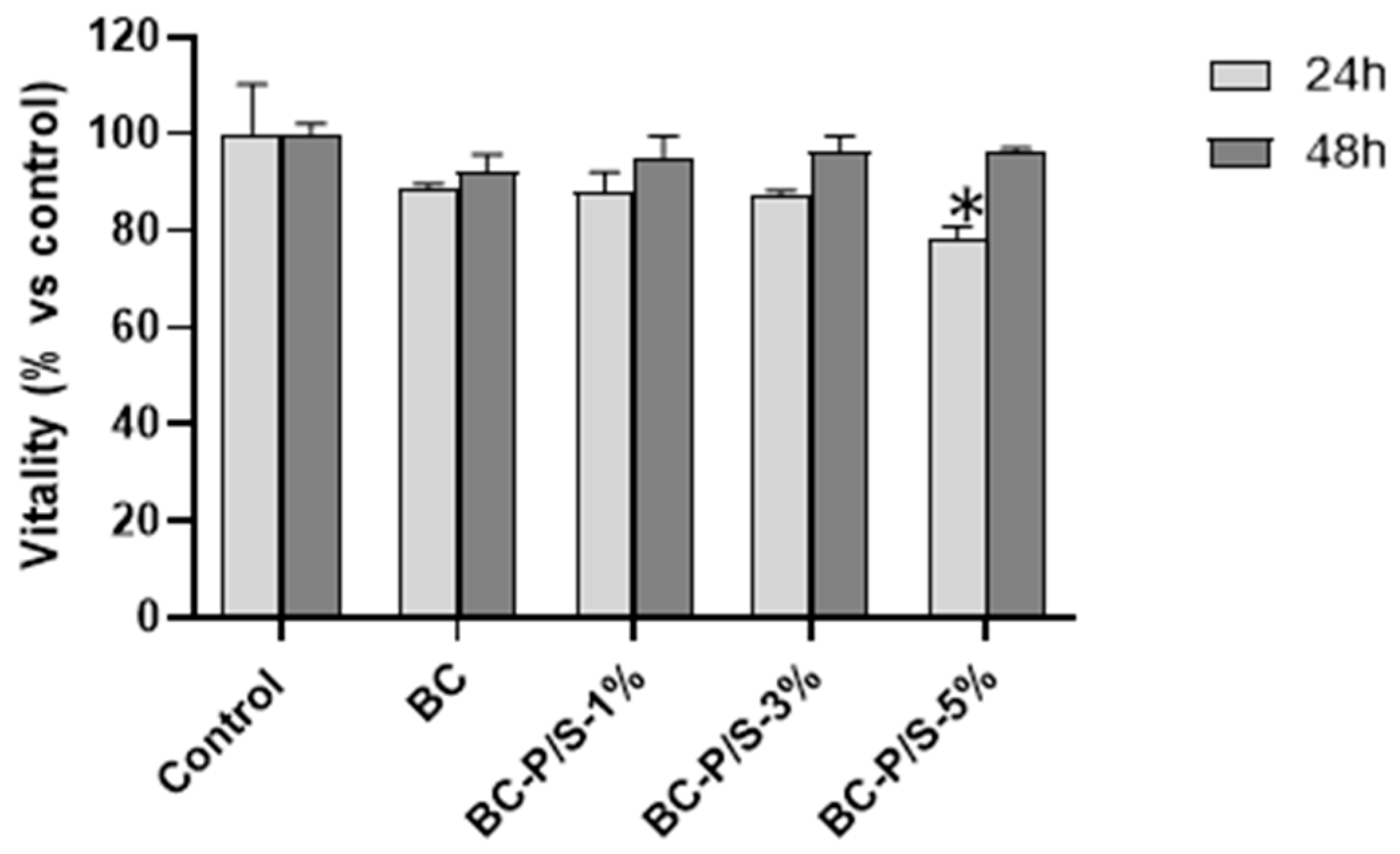 4.3.2. In Vitro Biocompatibility Assessment by MTT Assay