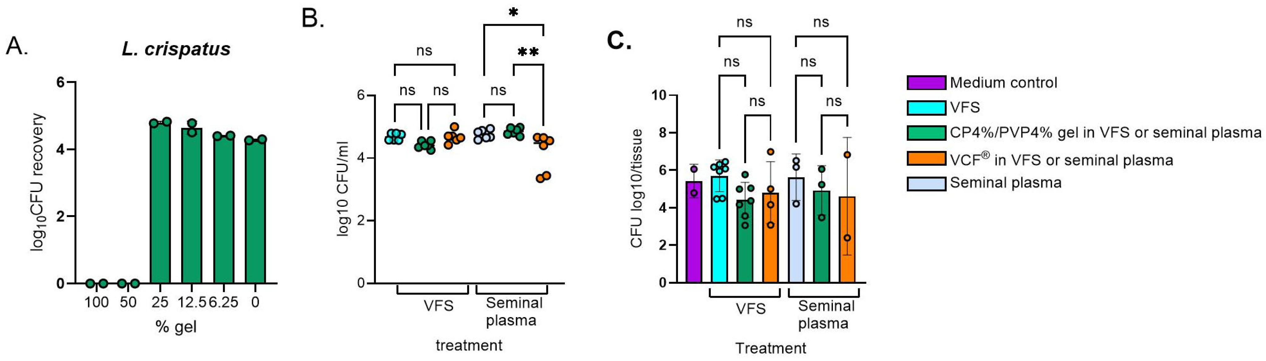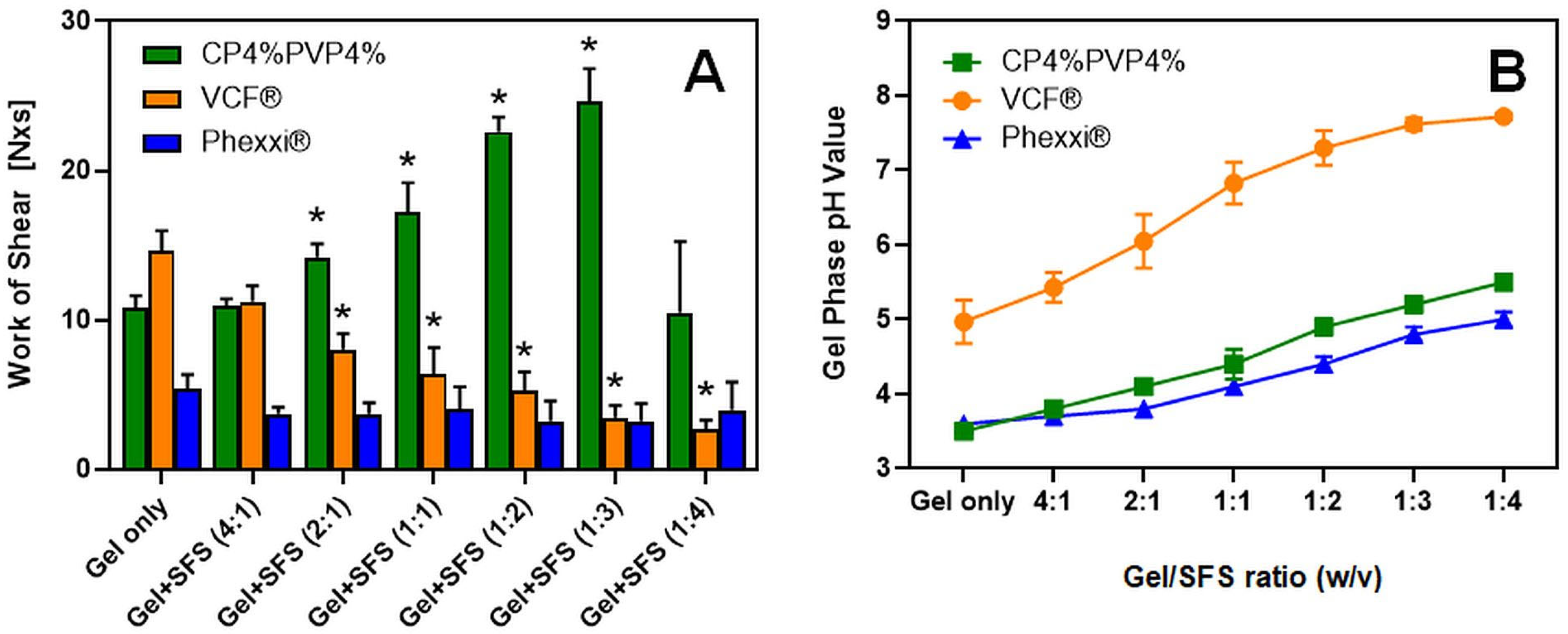 | Phexxi® gel | 6 | 64.3 ± 8.5 | 6.7 ± 0.1 * | 20.0 ± 6.9 * | 28.0 ± 22.1 * |