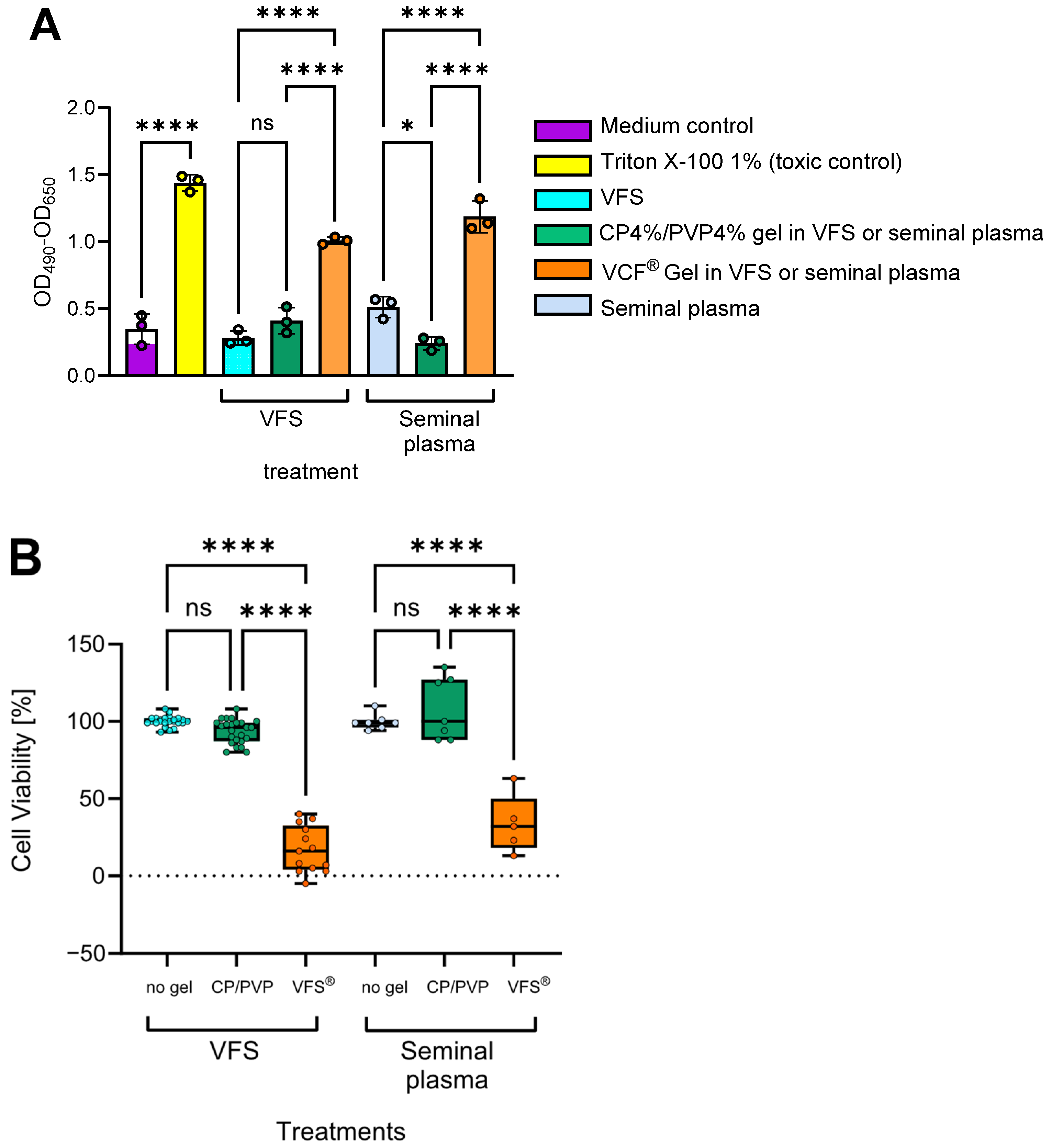 | VCF® Gel | 2 | Grade 1 (0/10) | 70.1 ± 105.1 | Vaginal discoloration (1/10) |