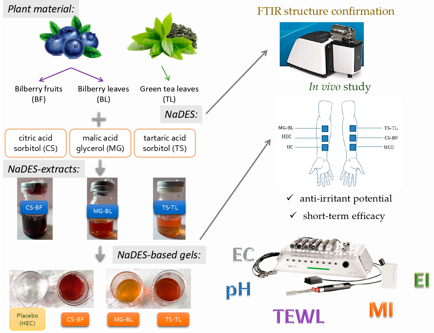 - Martinović, M.; Nešić, I.; Bojović, D.; Žugić, A.; Blagojević, S.; Blagojević, S.; Tadić, V.M. Plant-Based Sunscreen Emulgel: UV Boosting Effect of Bilberry and Green Tea NaDES Extracts. Gels 2024, 10, 825. [Google Scholar] [CrossRef]