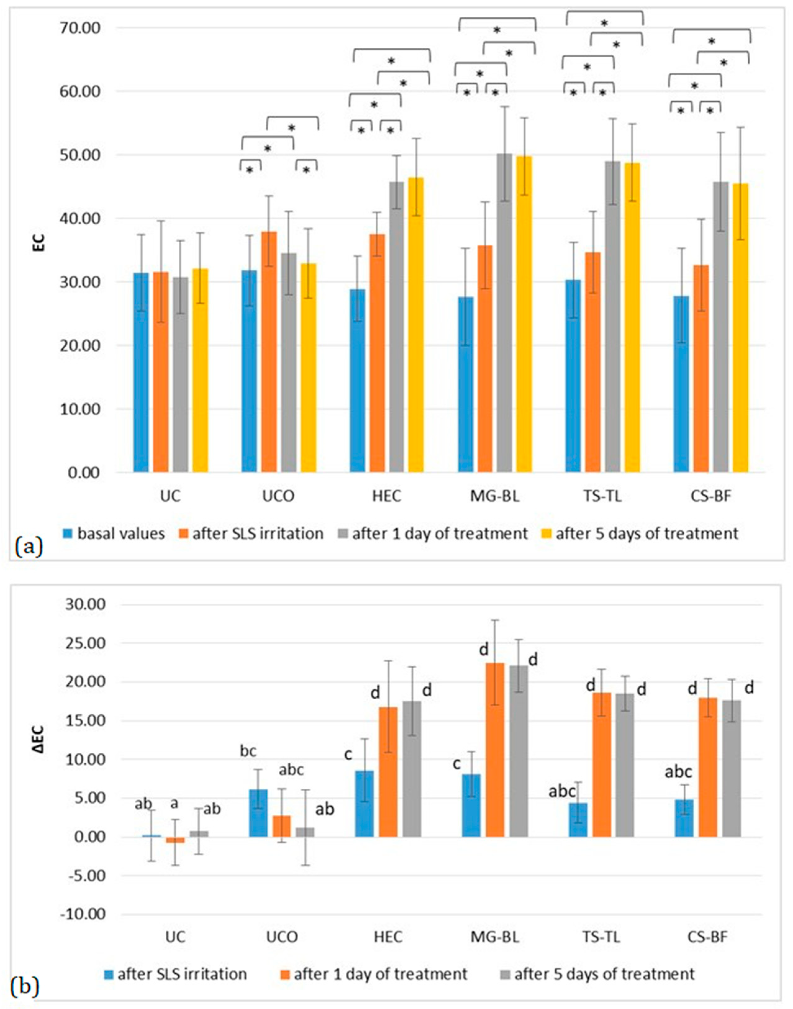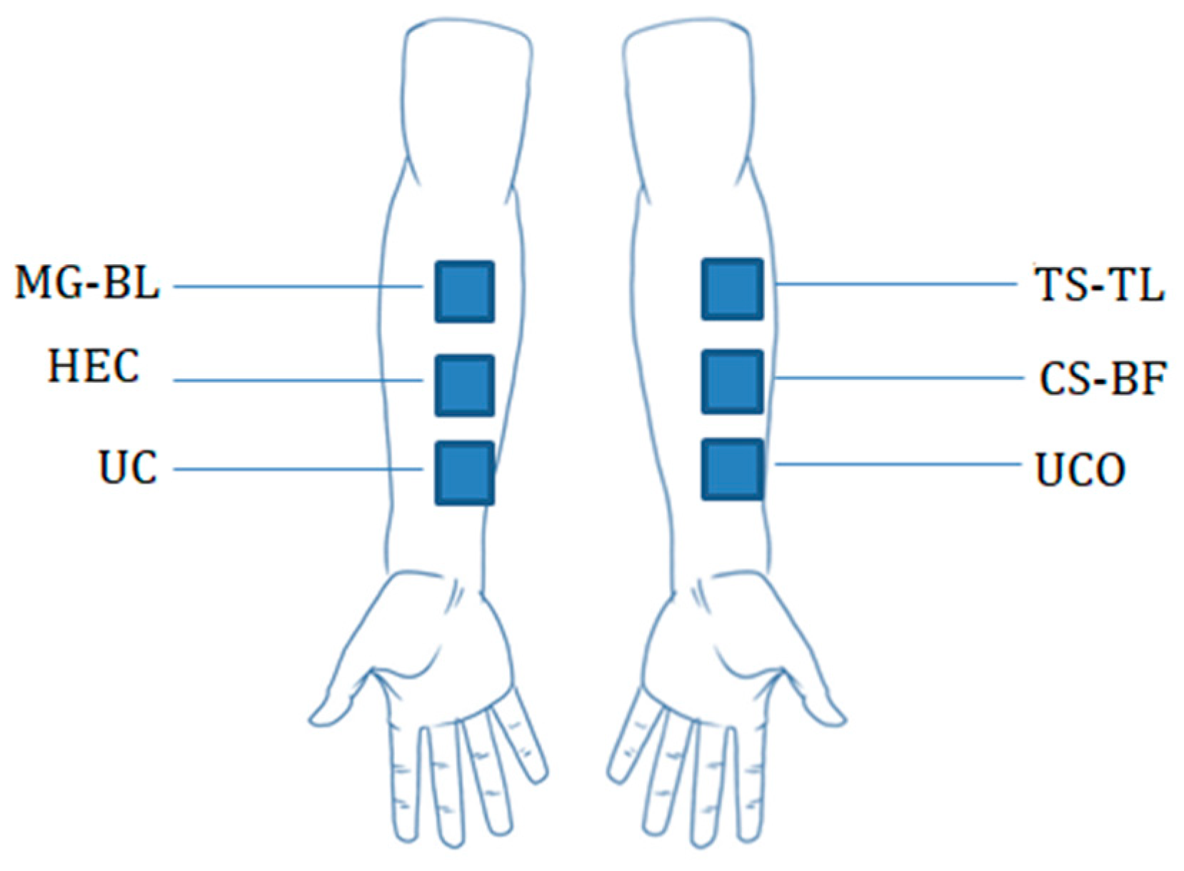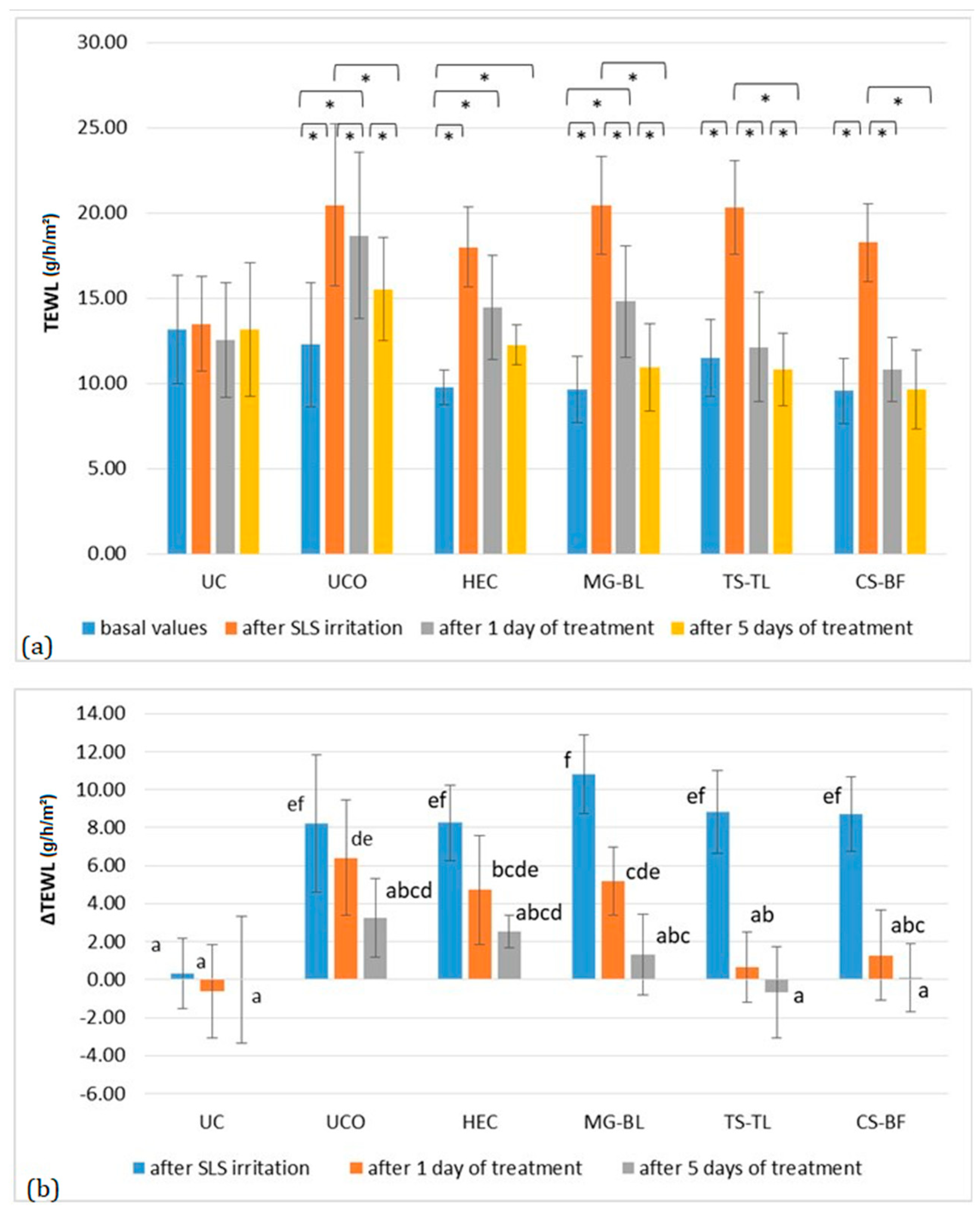 - Tewameter® TM 300—for evaluating transepidermal water loss (TEWL) following a device stabilization period of approximately 40 s; the TEWL value with the lowest standard deviation was recorded;