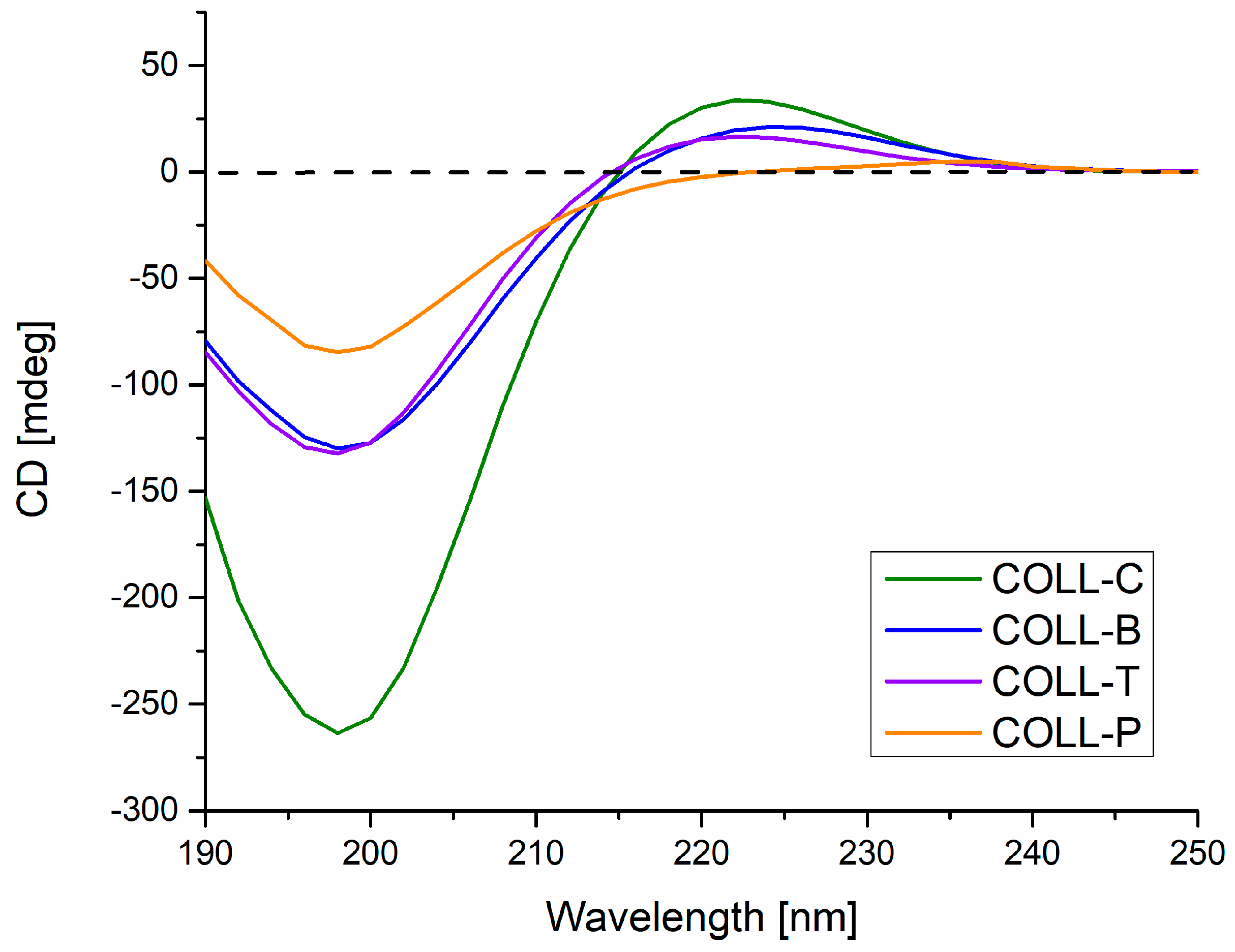 - Zhou, Y.; Li, S.; Wang, D.; Zhao, Y.; Lei, X. Estimation of Type i Collagen Structure Dissolved in Inorganical Acids from Circular Dichroism Spectra. Biosci. J. 2018, 34, 778–789. [Google Scholar] [CrossRef]