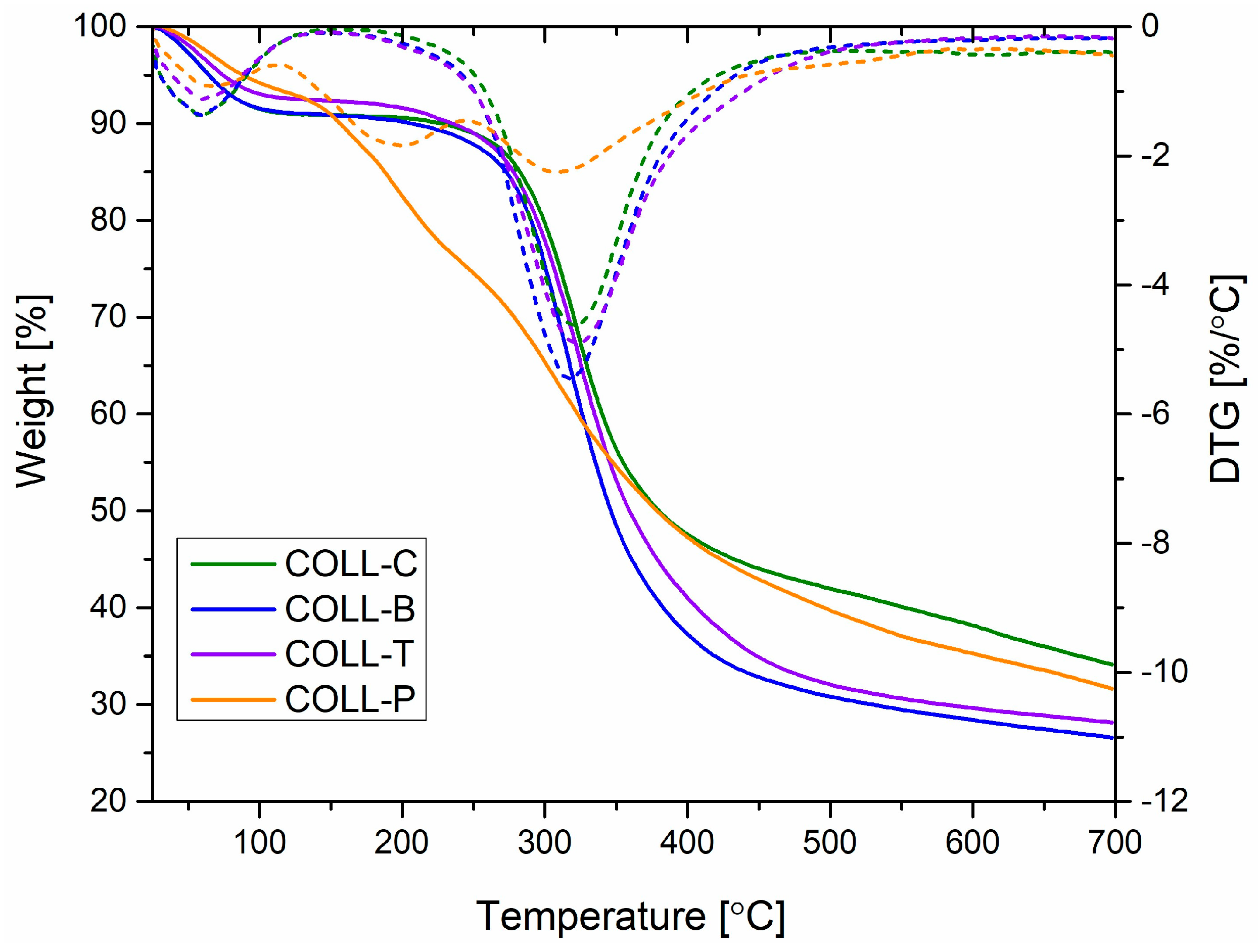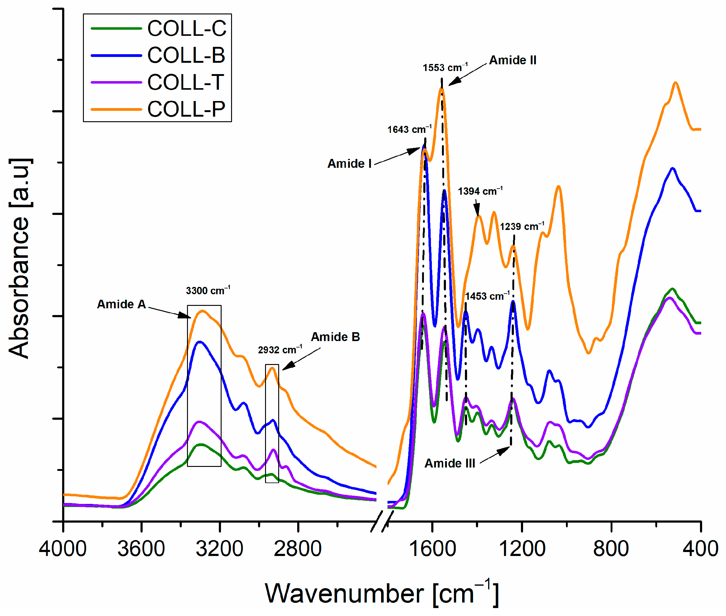 2.2.1. Structural Analysis of Collagen Porous Matrices—FT-IR Spectra