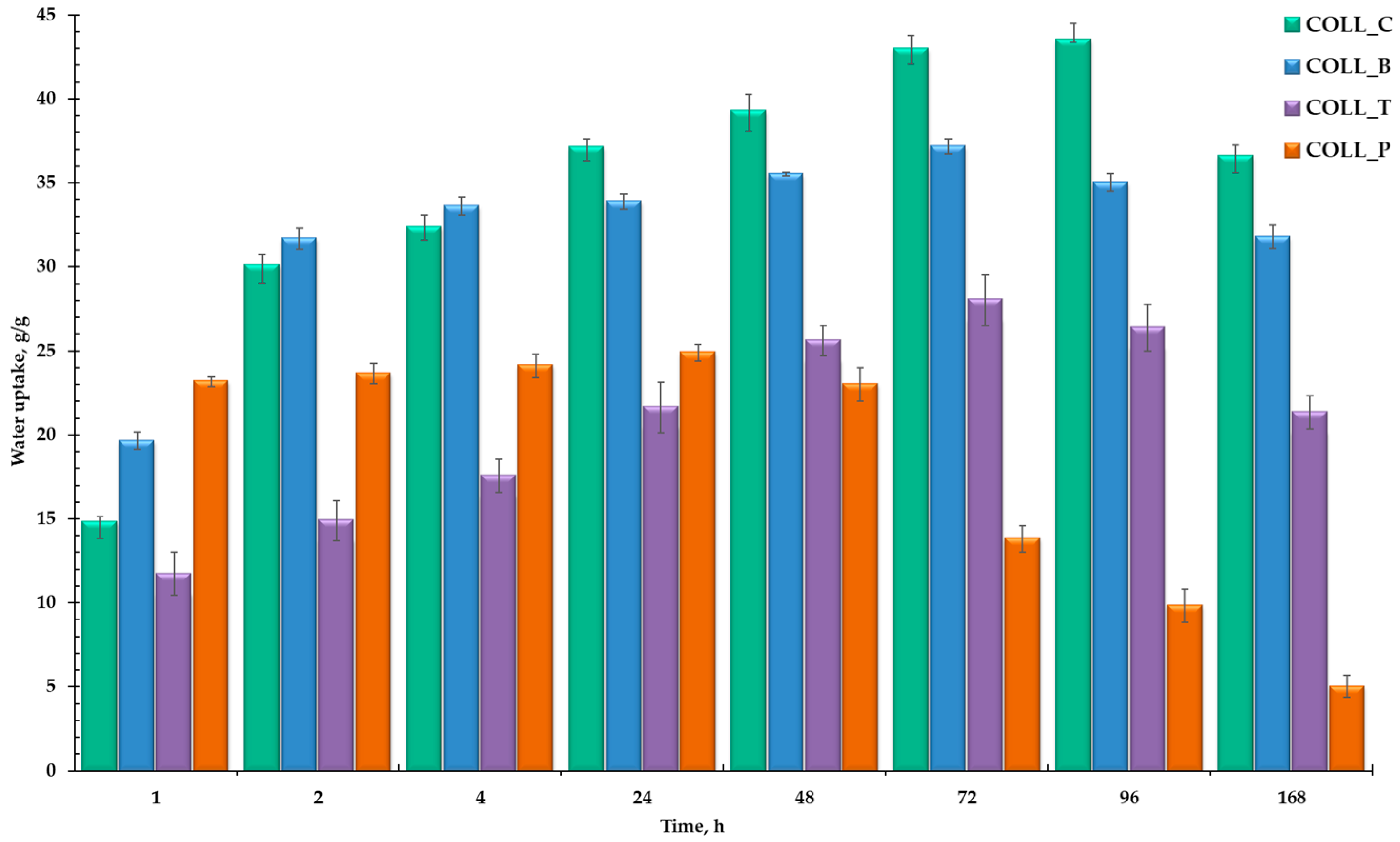 4.2.6. Swelling Behavior of Collagen Porous Matrices