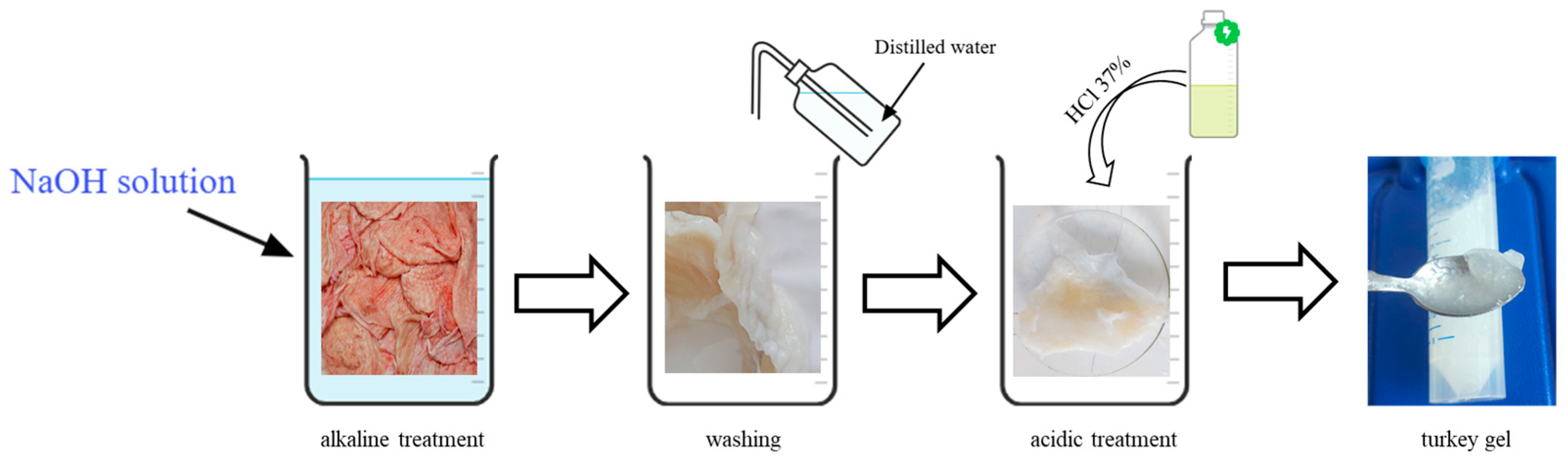 - Lamers, D.L.; Rigueto, C.V.T.; Krein, D.D.C.; Loss, R.A.; Dettmer, A.; Gutterres, M. Sequential Extraction and Characterization of Gelatin from Turkey (Meleagris Gallopavo) Feet. Polym. Bull. 2024, 81, 12151–12167. [Google Scholar] [CrossRef]
