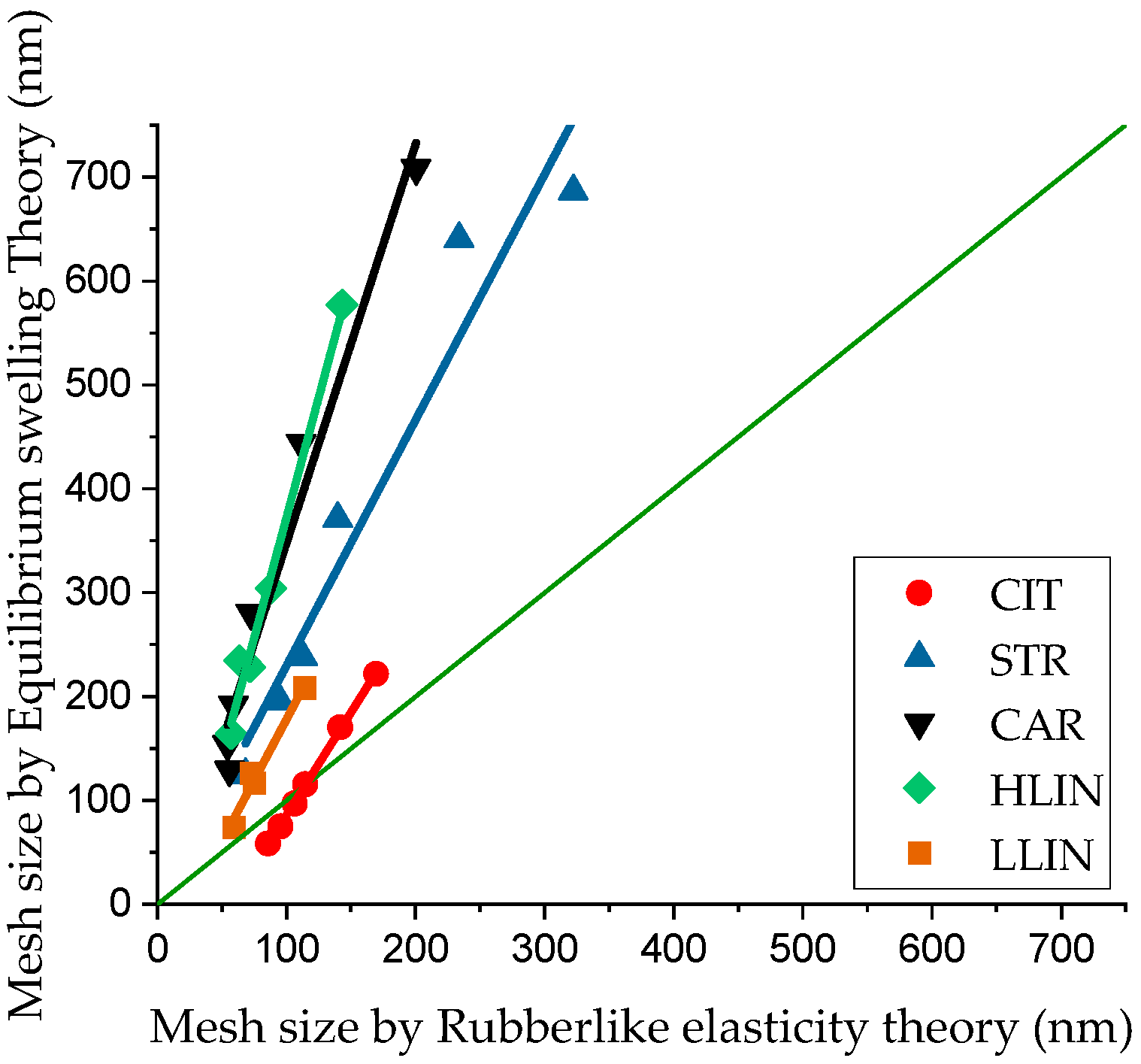 - Flory, P.J.; Rehner, J. Statistical Mechanics of Cross-Linked Polymer Networks II. Swelling. J. Chem. Phys. 1943, 11, 521–526. [Google Scholar] [CrossRef]