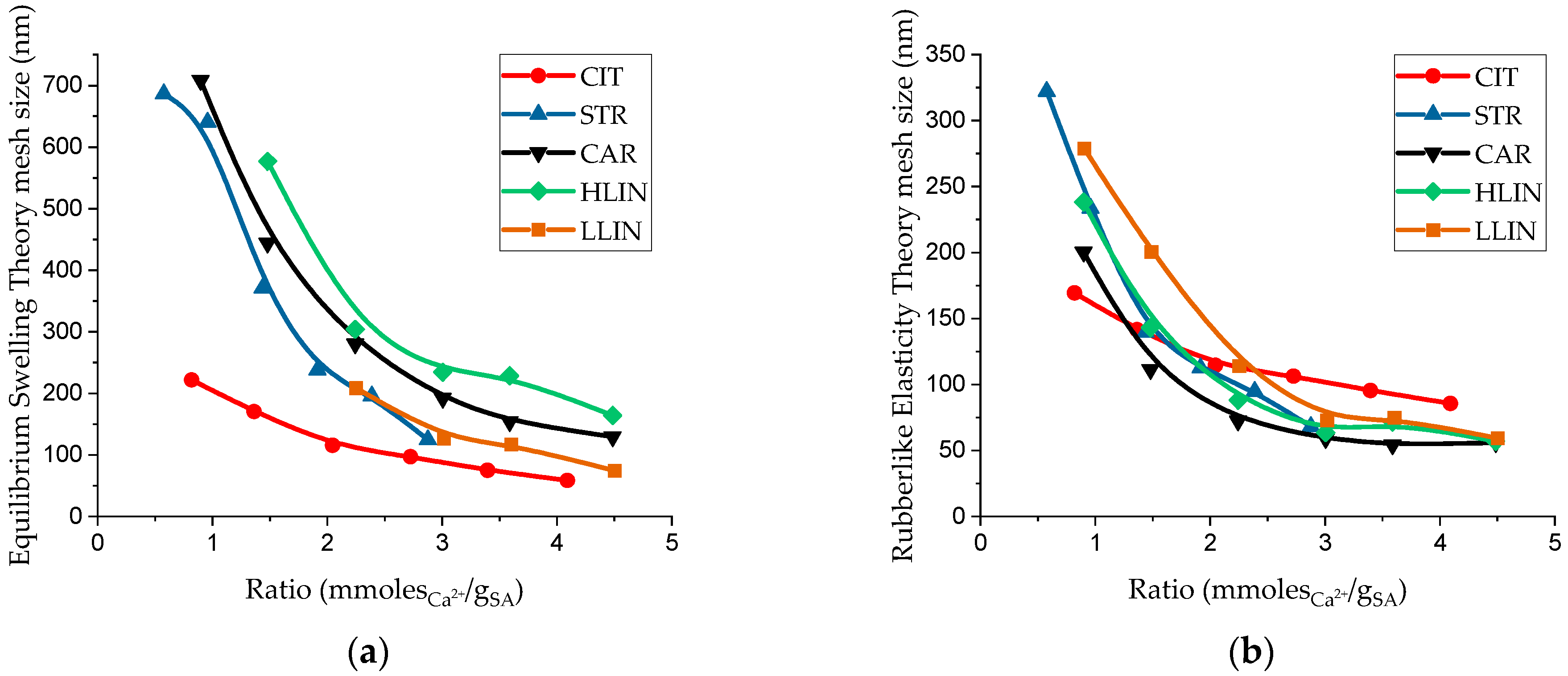 - Lee, K.Y.; Rowley, J.A.; Eiselt, P.; Moy, E.M.; Bouhadir, K.H.; Mooney, D.J. Controlling Mechanical and Swelling Properties of Alginate Hydrogels Independently by Cross-Linker Type and Cross-Linking Density. Macromolecules 2000, 33, 4291–4294. [Google Scholar] [CrossRef]