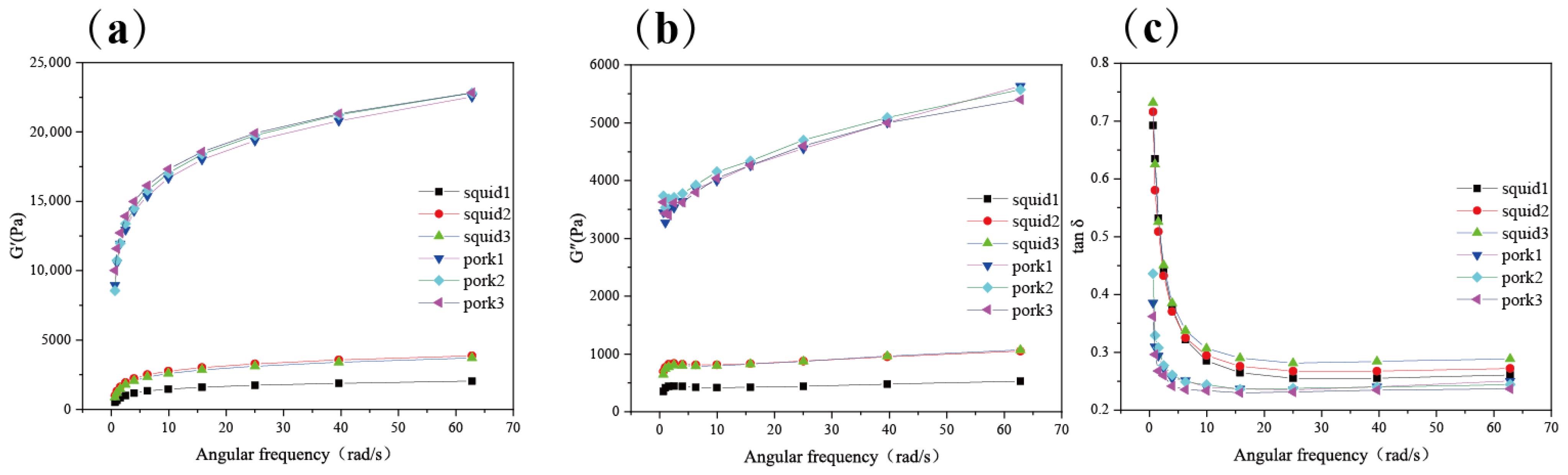 2.1. Comparison of Rheological Properties of Giant Squid and Pork