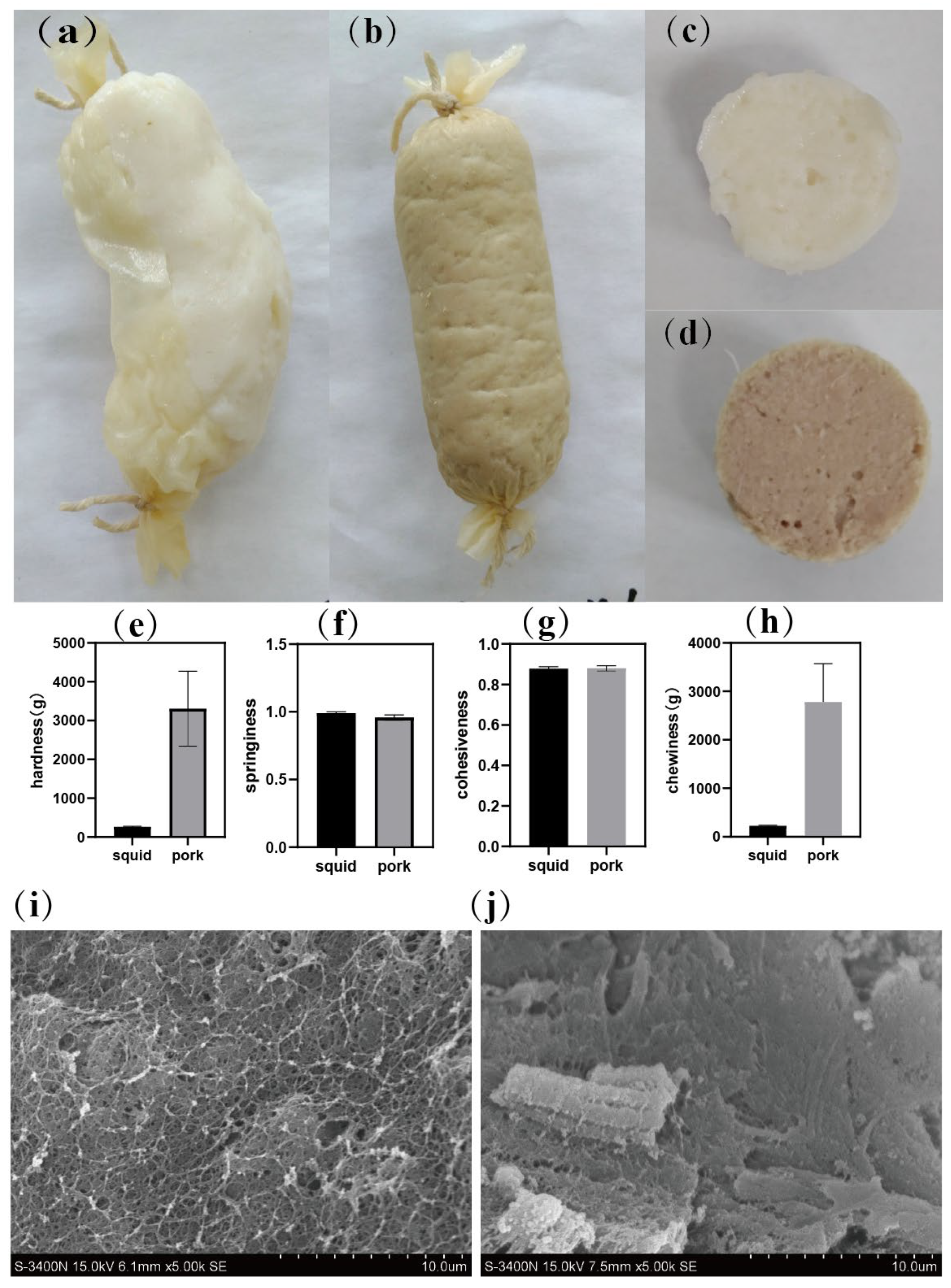 2.2. Comparison of Appearance, Texture, and Microstructure of Giant Squid and Pork