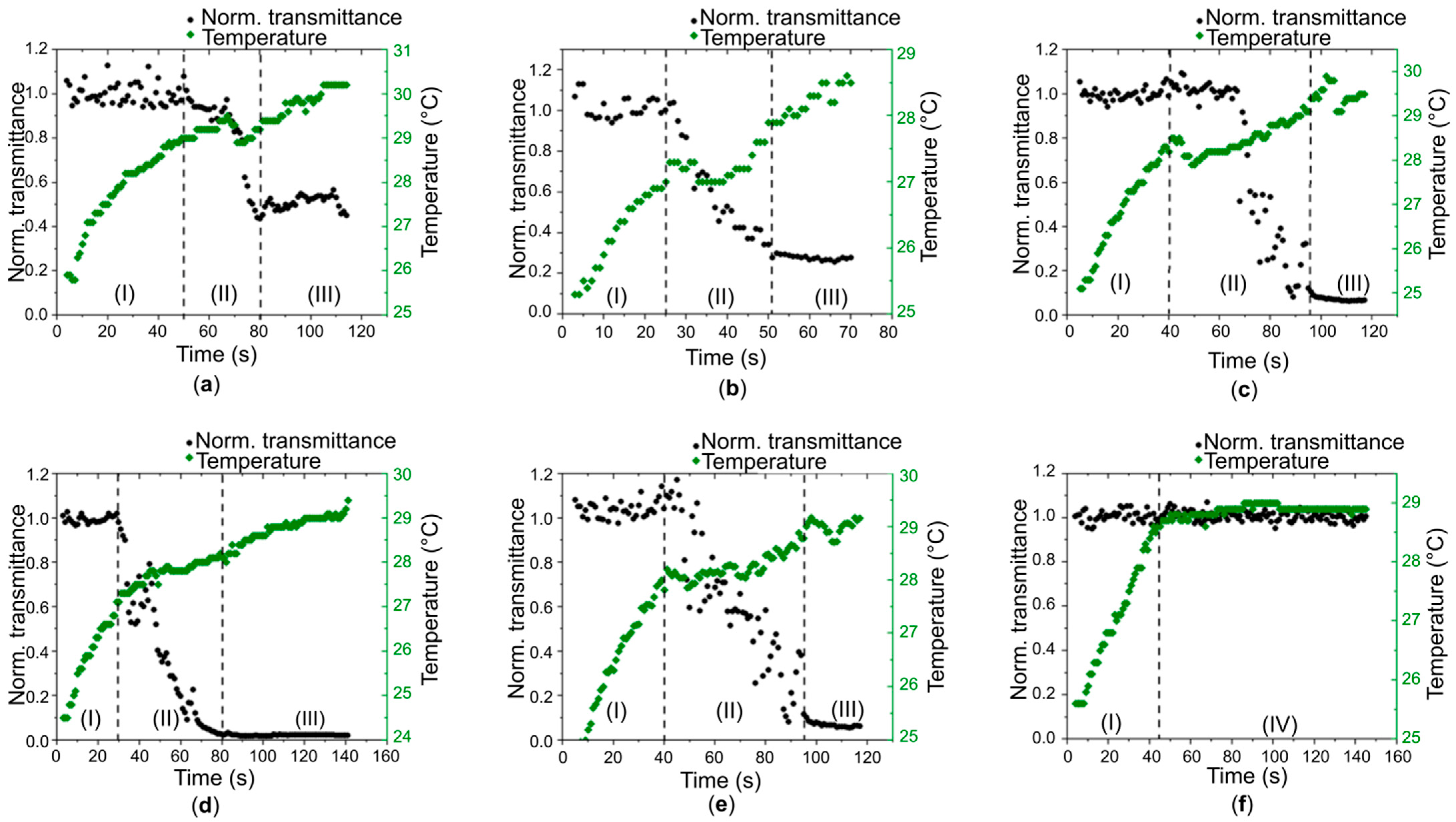 Using pulsed laser radiation with a power of approximately 190 mW and a repetition rate of 15 kHz, photopolymerization occurred over a prolonged period of up to 100 s. The laser energy parameters were selected to ensure sufficiently slow hydrogel formation, which eliminated the need for high-speed cameras and made it possible to use accessible measuring devices such as a pyrometer and thermal imager. Photopolymerization using the scanner system was performed at a higher radiation power, which made it possible to achieve photopolymerization in a shorter time. In the first seconds of exposure to radiation, sample 1 exhibited a temperature increase to 29 °C (Figure 2a) without any structural changes in the sample (area I). The rate of temperature increase then significantly decreased to less than 1 °C over 20 s, which was accompanied by a significant decrease in the normalized transmittance (area II). Upon completion of the hydrogel material formation, a constant value of the normalized transmittance was established, while the temperature continued to increase at approximately the same rate as in area I. Upon reaching a certain heating value, the further increase in temperature ceases and a stable equilibrium is established between the laser energy parameters and the temperature at the site of action (area III). A similar pattern was observed in other cases as well, with hydrogel formation occurring at temperatures of 27 °C (Figure 2b) and 28.5 °C (Figure 2c) for samples 2 and 3, respectively. A strong change in the normalized transmittance is observed, which may indicate the formation of a dense structure. In the case of sample 4 (Figure 2d), area II is located in the time interval from 35 to 80 s with a temperature of approximately 28 °C. Moreover, area III exhibits the lowest normalized transmittance of all the studied samples, indicating the most dense structure. For sample 5 (Figure 2e), the obtained temperature and normalized transmittance dependences on time are similar to those for sample 3. Figure 2f shows data for irradiating the sample out of focus (offset 3 mm). For this case, areas II and III were not detected; after heating by laser radiation (area I), area IV was observed, which is characterized by both the absence of heating and a constant normalized transmittance.