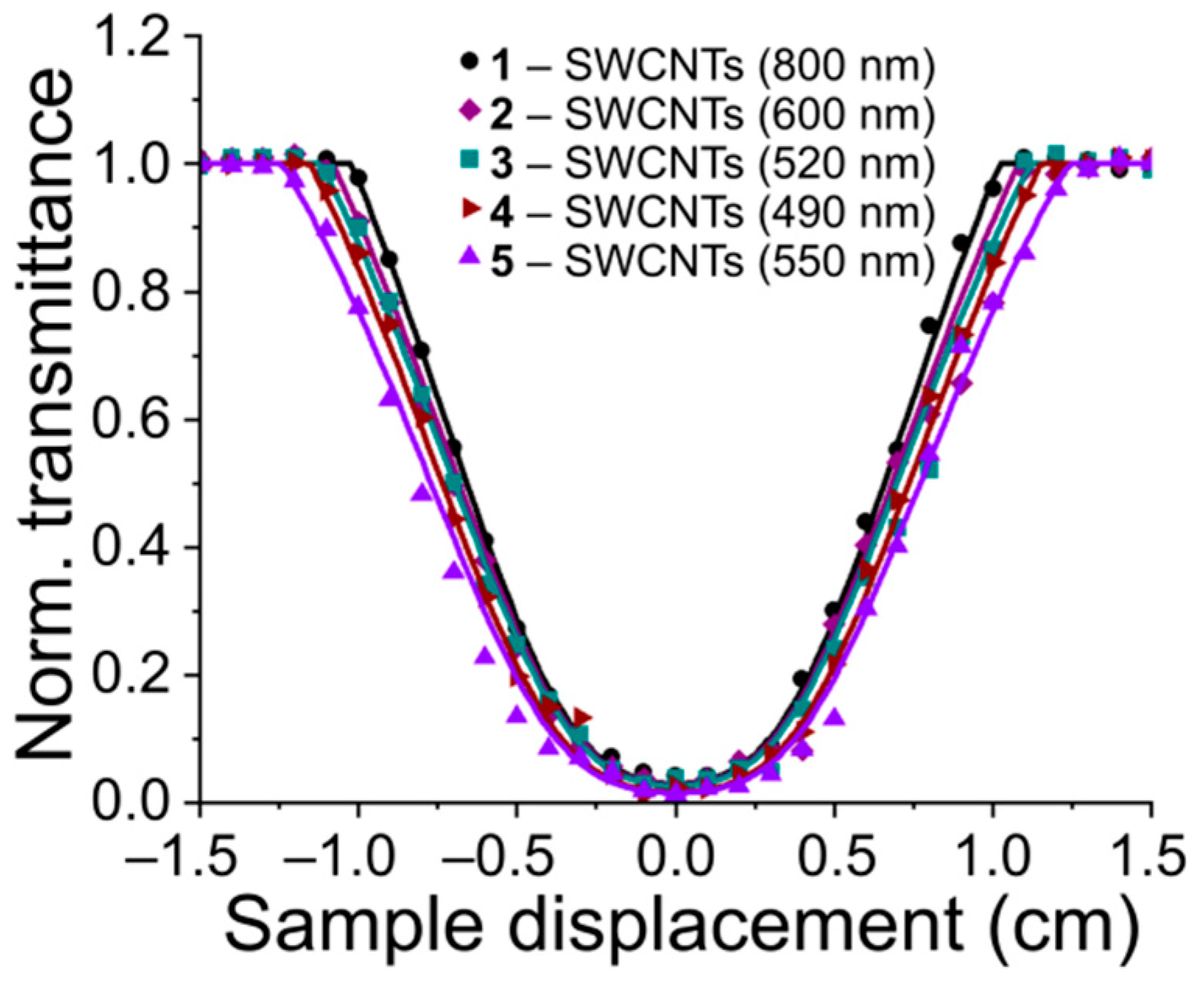 The cross-section of the nonlinear absorption coefficient σ was obtained using the open-aperture Z-scan method [24,42] (Figure 3) for five photocurable media. A decrease in the threshold exposure of laser radiation was found when nanotubes with a smaller hydrodynamic radius were used in the dispersion composition. For all samples, the nonlinear refractive index was determined taking into account the number of rings observed in the diffraction pattern. Figure 4 shows the results of the corresponding modeling.
