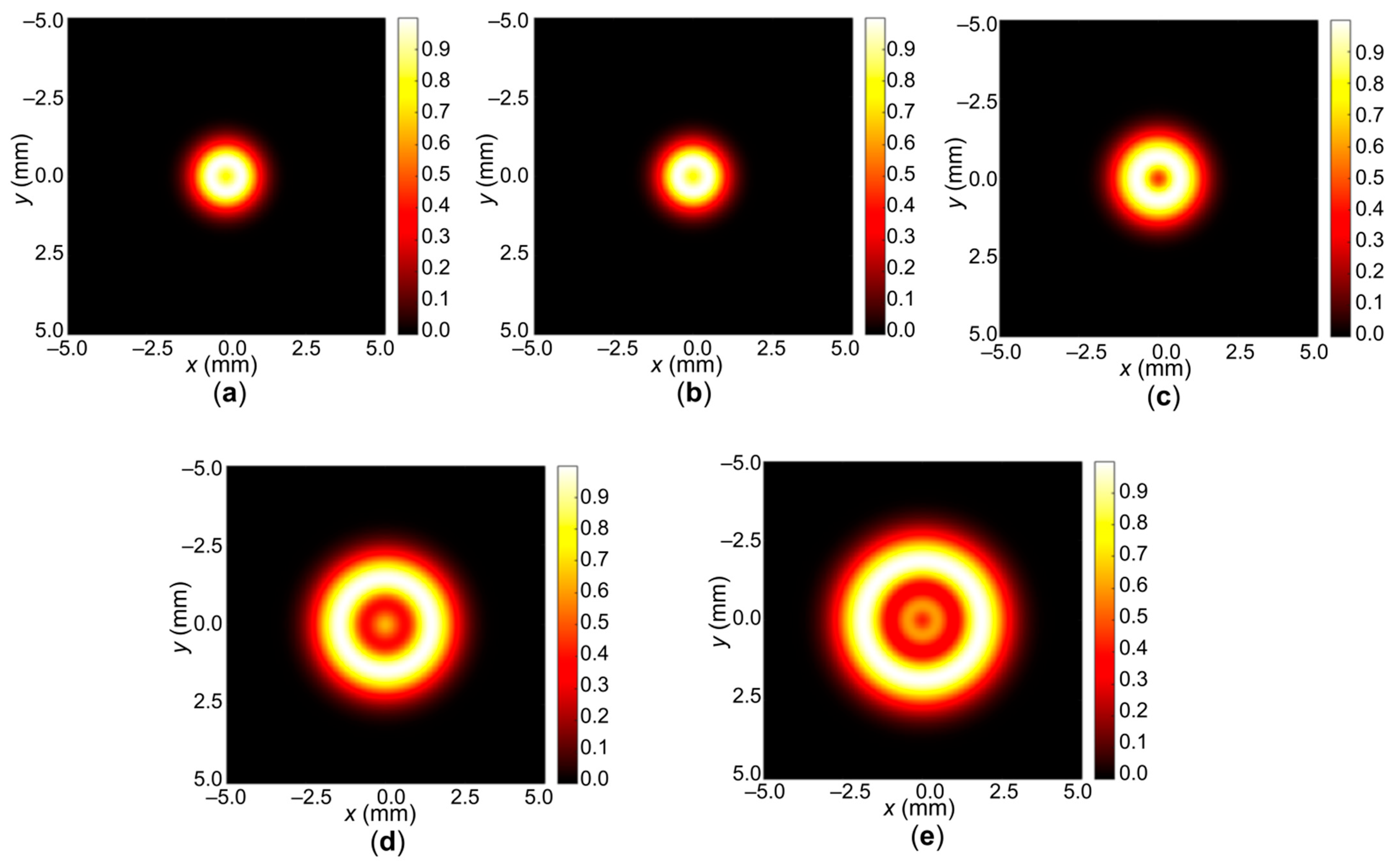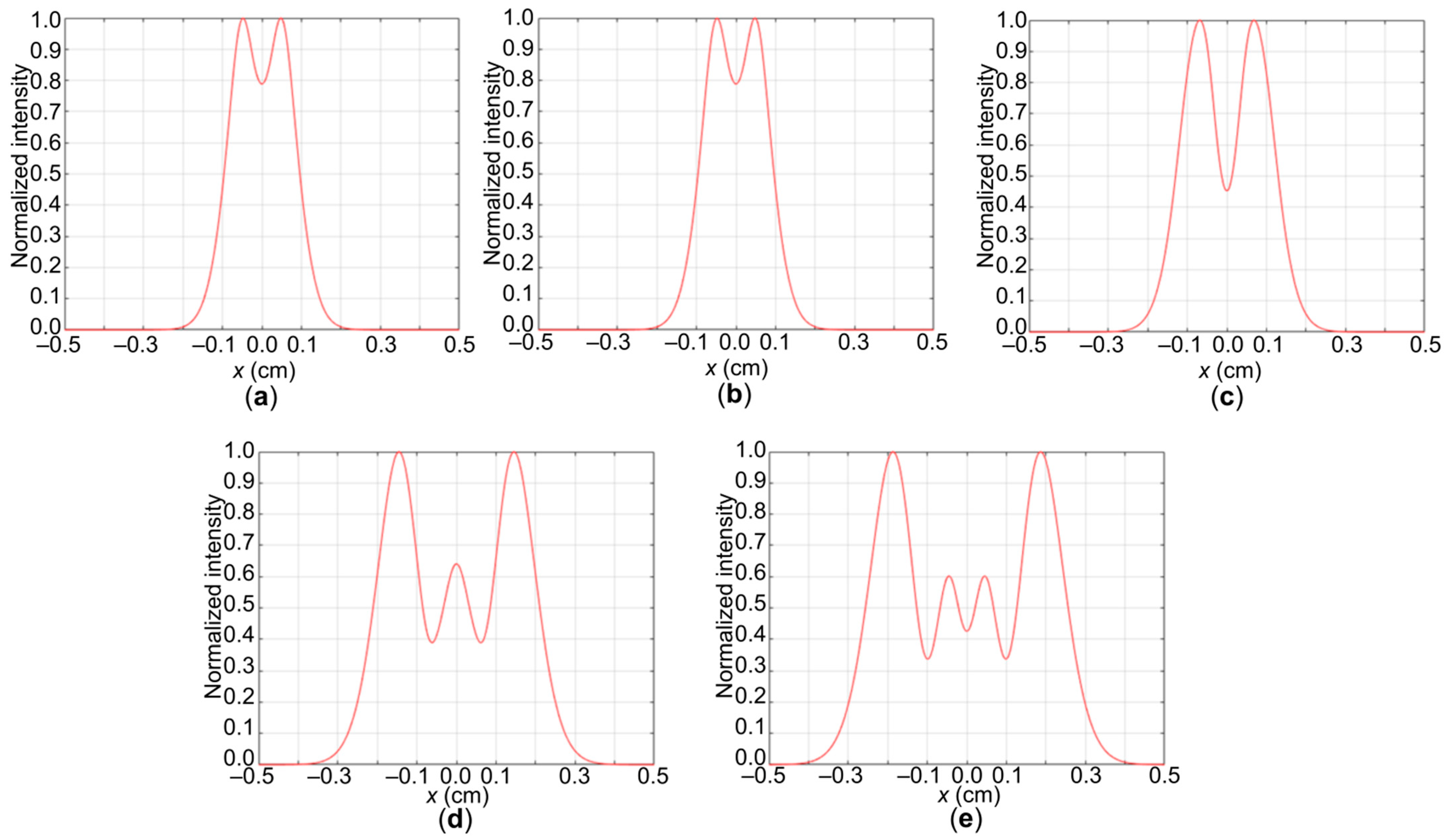 In the case of sample 1 (Figure 4a), the smallest spot diameter is observed, which approximately coincides with sample 2 (Figure 4b). Further, for sample 3, the formation of a diffraction pattern with the formation of phase rings becomes noticeable (Figure 4c). In the case of samples 4 (Figure 4d) and 5 (Figure 4e), the diameter increases, and the rings themselves become more noticeable. For simplicity of analysis, projections of the normalized intensity along the x-axis are shown. In the case of samples 1 (Figure 5a) and 2 (Figure 5b), the presence of one ring is already visible. For sample 3 (Figure 5c), the difference in the normalized intensity increases and the ring becomes distinguishable. For samples 4 (Figure 5d) and 5 (Figure 5e), two rings are observed, which are better distinguishable for sample 5.
