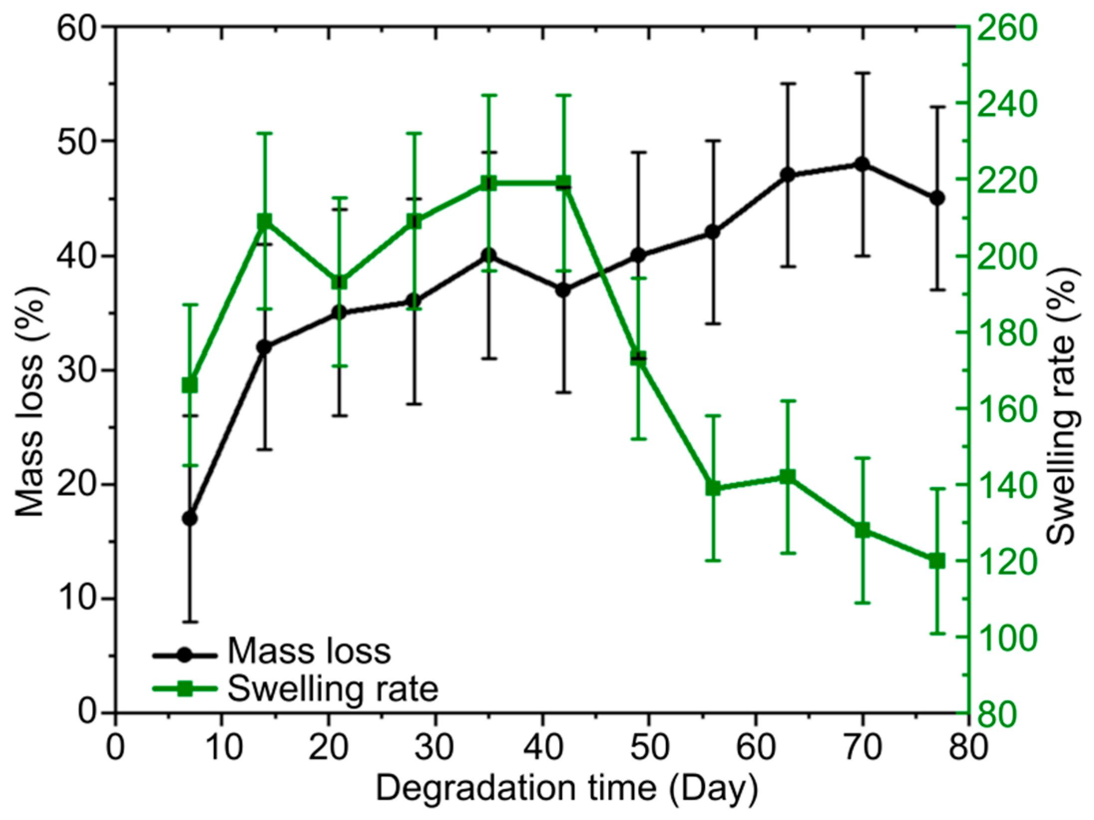 Figure 7. Mass loss and swelling rate of Col/BSA/CS/Eosin Y/SWCNTs (490 nm)/rGO hydrogel (sample 4) over an 80-day observation period.