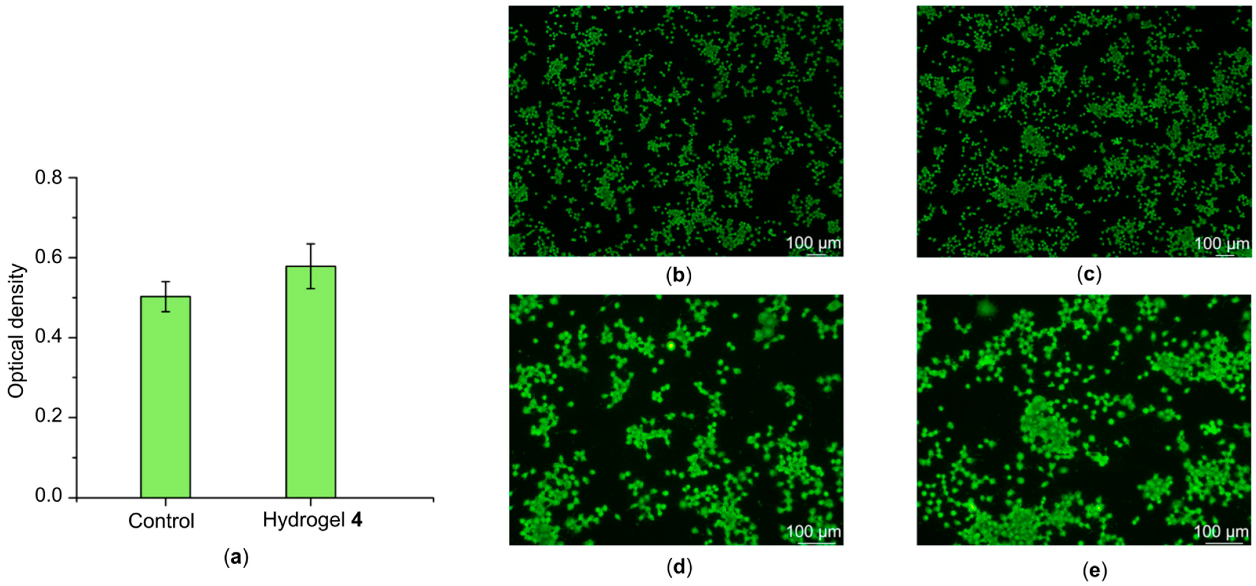Figure 8. Biocompatibility study results after 72 h of Neuro-2A cell cultivation: (a) MTT assay; (b) fluorescent microscopy for control and (c) hydrogel Col/BSA/CS/Eosin Y/SWCNTs (490 nm)/rGO 4; (d) fluorescent microscopy with a 2× increase for control and (e) hydrogel Col/BSA/CS/Eosin Y/SWCNTs (490 nm)/rGO 4.