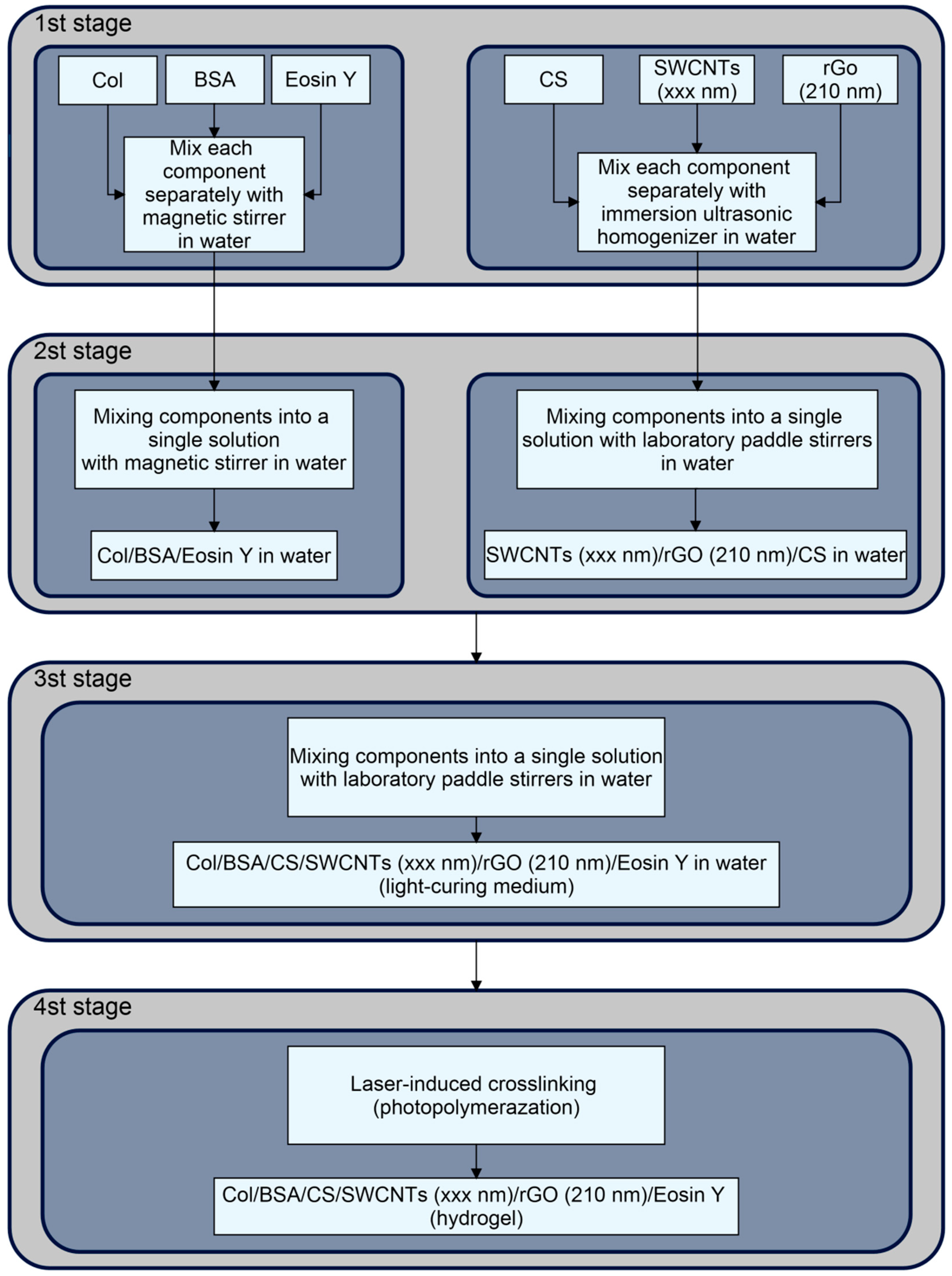 Figure 9. Preparation scheme for the Col/BSA/CS/Eosin Y/SWCNTs/rGO photopolymerizable medium. The arrows show the sequence of adding components and their subsequent processing.