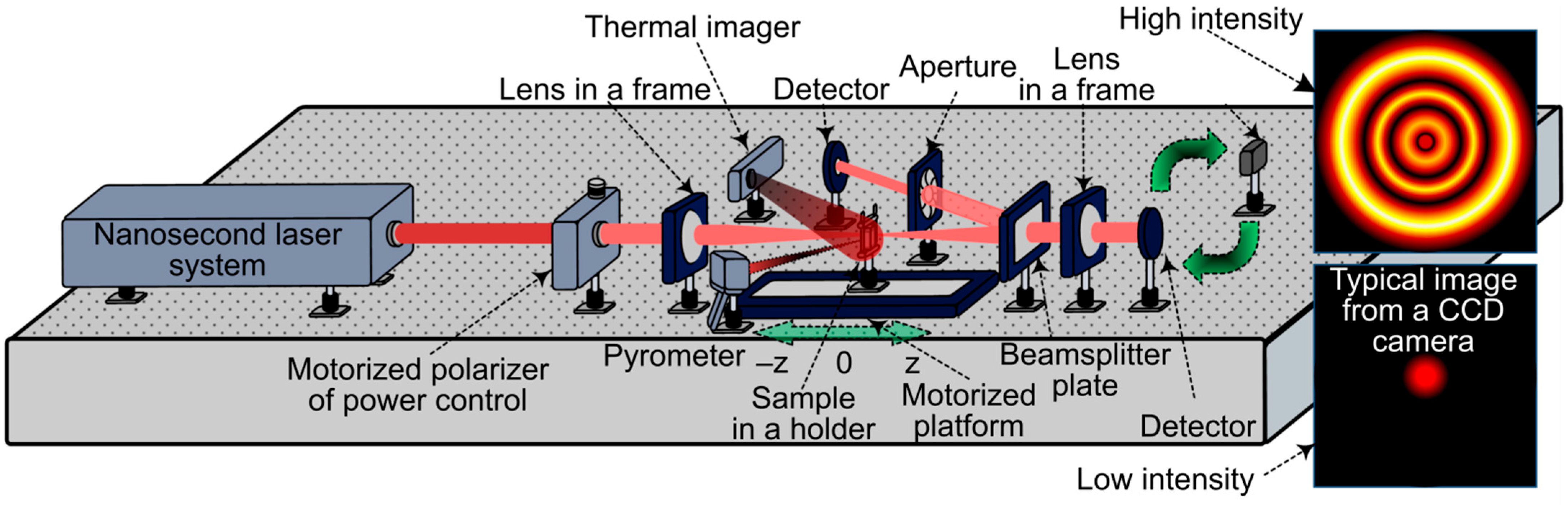 where n0 is linear refractive index, nn is nonlinear refractive index, and I is intensity of the incident laser radiation. A change in the refractive index under the influence of laser radiation results in a change in the phase of the wave front φ in accordance with Equation (2):