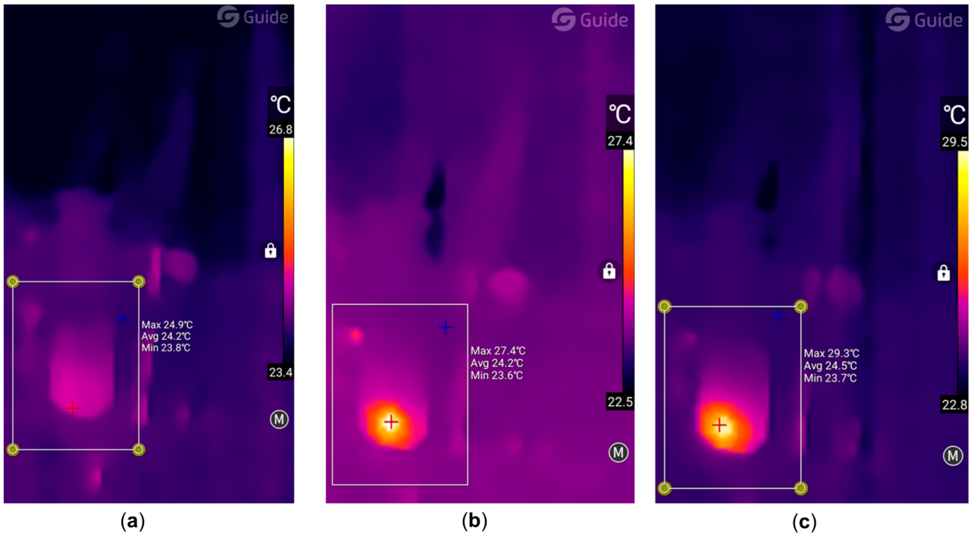Figure 11. Typical images obtained by a thermal imager for sample 4 (Col/BSA/CS/Eosin Y/SWCNTs/rGO) with 490 nm SWCNTs: (a) initial moment, (b) photopolymerization, and (c) sample formation.