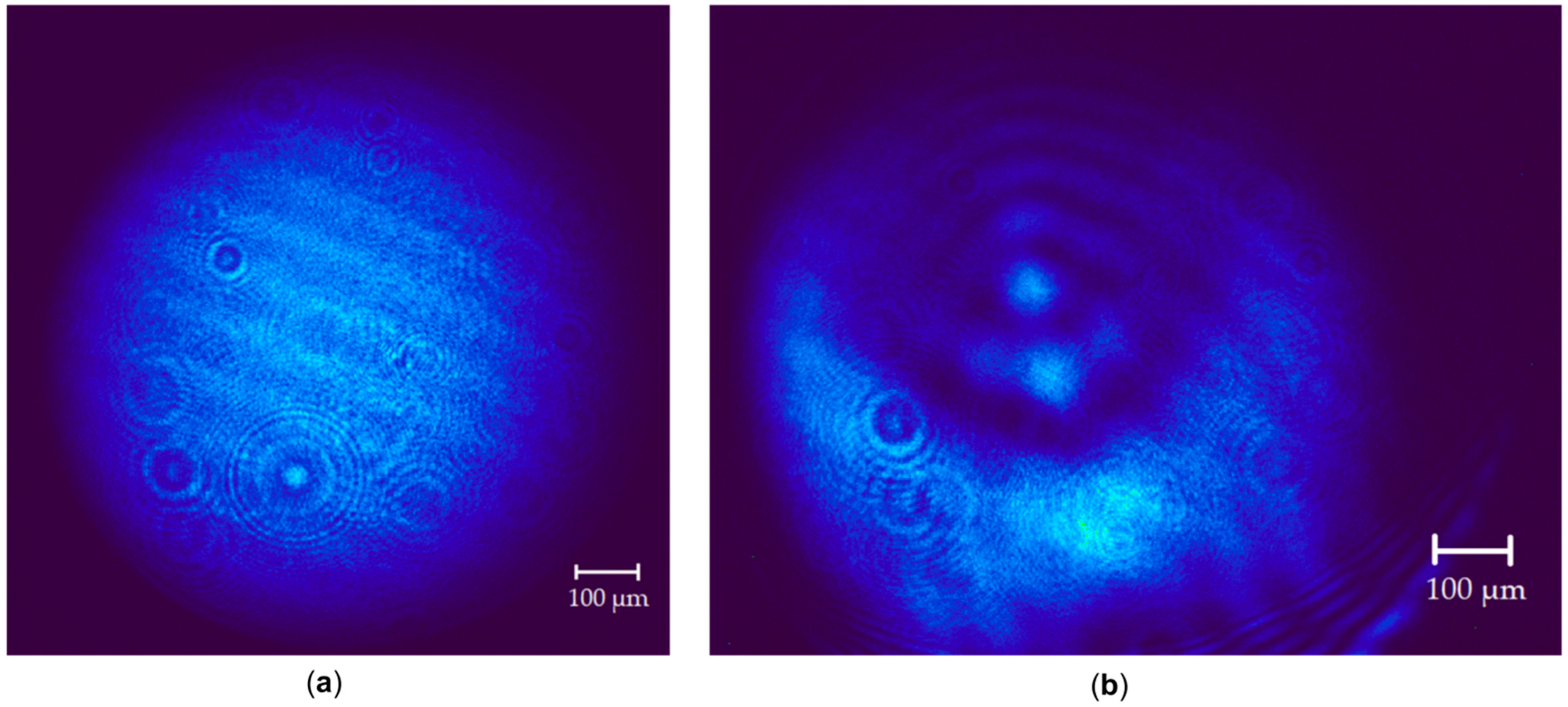 where d is sample thickness. Such phase shift causes propagation velocity modulation for different sections of the laser beam and, as a consequence, a change in the spatial beam profile and the observation of a stable diffraction pattern. The method based on the Fresnel–Kirchhoff diffraction integral used to reproduce the diffraction ring pattern is described in detail in [43]. The modeling used values of linear and nonlinear refractive indexes, presented in Table 2.