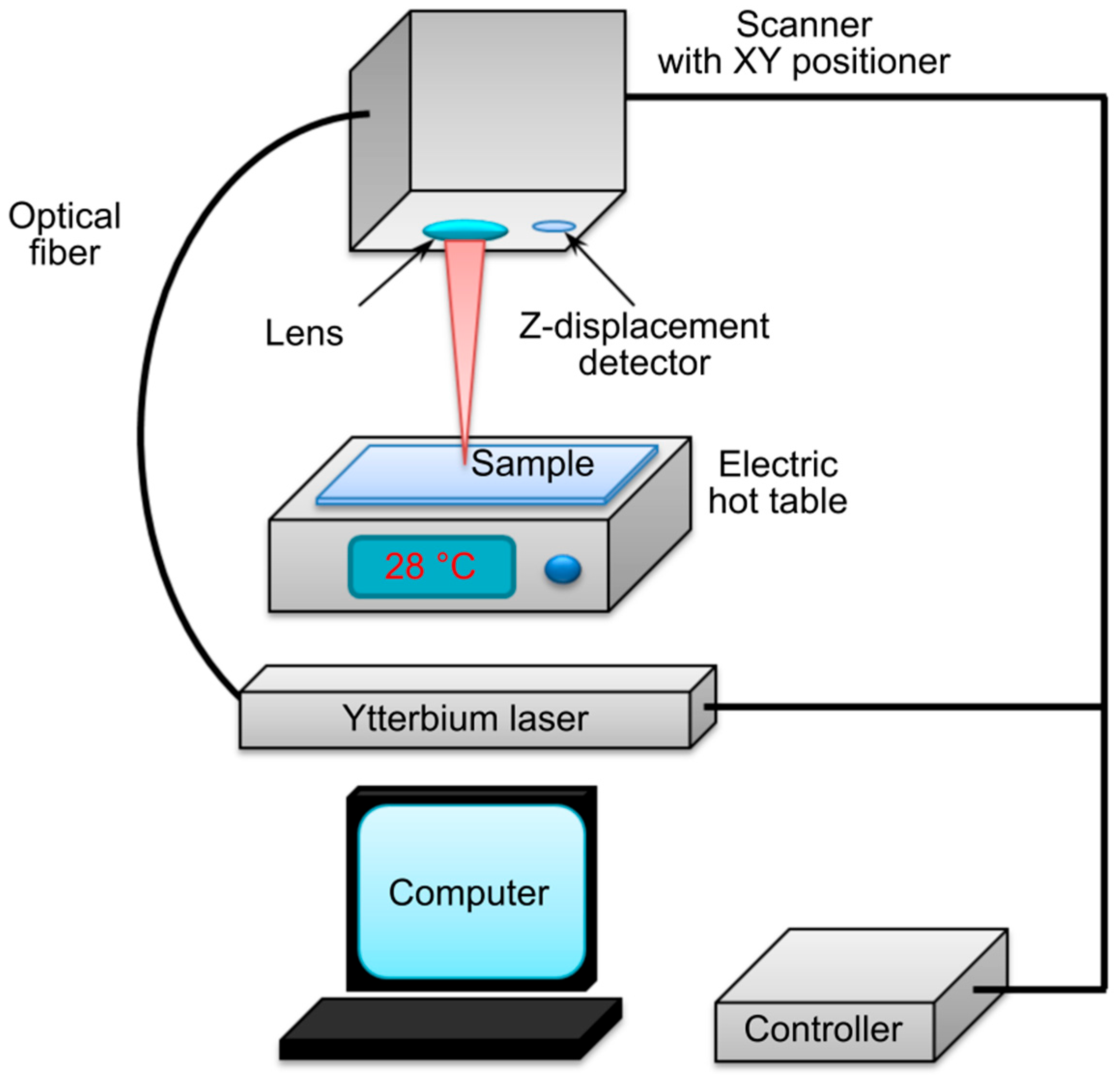 To evaluate electrical conductivity, hydrogel samples were fabricated in a square shape measuring 5 × 5 mm2. Specific electrical conductivity was determined using the four-probe van der Pauw method (Suzhou Jingge Electronics Co., Ltd., Suzhou, China) at room temperature (25 °C) and a temperature close to the intraorganismic environment (37 °C). Photopolymerization was carried out using a fiber laser equipped with a scanning system (Figure 13), delivering pulses with a duration of 100 ns, a repetition rate of 30 kHz, and a wavelength of 1070 nm. The radius of the laser spot at the objective focus was 19 µm. The laser trajectory was computer-controlled. The laser power was set above the threshold exposure determined from the temperature-versus-time studies. This setting was necessary to achieve photopolymerization at a scanning speed of 240 mm/s with a single pulse energy of ~100 µJ. In the presence of Col, CS, and BSA molecules containing cationic groups, ionic interactions with the anions of Eosin Y are induced, accompanied by hydrogen bond formation. SWCNTs and rGO further connect via weak van der Waals forces, acting as secondary stabilization mechanisms, as confirmed by spectroscopic analysis [24]. Based on the analysis of the temperature dependence on irradiation time, a working temperature of 28 °C was established and maintained by a heating stage.