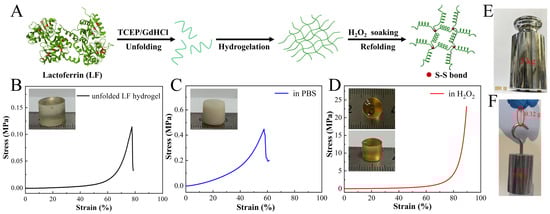 Further, these findings were confirmed by the Fourier-transform infrared spectroscopy (FTIR) analysis. In the FTIR spectra, the typical peaks at 1650–1655 cm−1 could be attributed to the amide I region (corresponding to α-helix), which were decreased after treating LF with denaturant (Figure S4B). Nevertheless, the peak corresponding to α-helix recovered after H2O2 soaking, indicating the refolding of α-helix [32]. Such a physically and chemically crosslinked hydrogel demonstrated amazing stiffness and toughness. As depicted in Figure 1D, the LF hydrogel demonstrated the ability to withstand a compressive strain exceeding 90% and a stress exceeding 20 MPa. Three such cylindrical LF hydrogels with a diameter of 8 mm and a height of 10 mm sustained a loading stress of 50 N without any fractures, bearing a load more than 1500 times their weight, and resisting slicing with a sharp knife (Figure 1E,F and Figure S5). To the best of our knowledge, the resultant LF hydrogel was superior to many reported protein hydrogels, such as gelatin or silk fibroin gel, which could only exhibit a kilopascal-order stiffness [33,34,35,36,37].