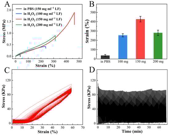 Remarkably, the tensile test revealed the exceptional stretchability of H2O2-treated LF hydrogel. As shown in Figure 2A, the fracture strain of the hydrogel prepared by 150 mg mL−1 LF was 426 ± 34% with a stress of 1.54 ± 0.36 MPa after H2O2 soaking. The resultant value was significantly higher than that of the PBS-equilibrated hydrogel, with a stress of 0.08 ± 0.02 MPa and a fracture strain of 35 ± 11% (Figure 2A,B). The original, unfolded hydrogel was soft and ruptured easily under slight stretching. An intriguing observation was made in terms of the correlation between the strength and stretchability of H2O2-treated LF hydrogel and the concentration of LF. It was observed that the hydrogel prepared by 150 mg mL−1 LF showed the highest breaking tensile strain compared to its 100 and 200 mg mL−1 counterparts (Figure 2B). The swelling test analysis revealed that LF hydrogels at different concentrations showed a similar volume shrinkage after H2O2 soaking (Figure S6A). It means these three hydrogels have different water content, leading to an obvious difference in stiffness (Figure S6B). In detail, the hydrogel at a concentration of 200 mg/mL presented the lowest water content but the highest stiffness. However, a dramatic increase in hydrogel stiffness is often accompanied by a compromise in stretchability [38]. Therefore, although the LF hydrogel at 200 mg/mL presented the highest stiffness, reaching a stress of ~5 MP at 80% strain, the stretchability of the LF hydrogel at 200 mg/mL was weaker than that of the LF hydrogel at 150 mg/mL. The H2O2-treated LF hydrogel was subjected to 200 consecutive loading-unloading cycles at a strain of 60%. The hydrogel showed little fatigue, retaining approximately 80% of the original stress in the first cycle, indicating a desired anti-fatigue performance (Figure 2C,D).