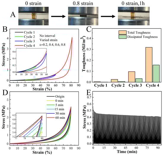 The H2O2-treated LF hydrogels not only possessed high compressive strength but also showed the excellent property of fast recovery (Figure 3A). In consecutive compression tests, the hydrogel promptly regained its original dimensions after unloading at lower strains (<60%), with small hysteresis (Figure 3B,C). At 80% strain, the hydrogel exhibited a noteworthy toughness of 320 KJm−3. About 80% of the original energy dissipation recovered immediately after unloading, with the remaining 20% recovering within 60 min (Figure 3D). Moreover, the hydrogel showed a desired anti-fatigue property, retaining about 75% of its original strength after 500 consecutive loading-unloading cycles at 60% strain (Figure 3E). Collectively, these results revealed that H2O2-treated LF hydrogels exhibited impressive features, including stiffness, toughness, and anti-fatigue performance. These characteristics are uncommon in protein hydrogels and even superior to those observed in certain polymer hydrogels [39,40].