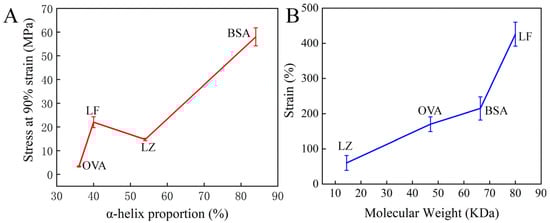 The relationship between protein attributes and the mechanical properties of hydrogel via examining the structure and properties of four cysteine-rich proteins and corresponding hydrogels. (A) α-helix proportion of four proteins and compression stress of the hydrogel made from the corresponding protein. (B) The molecular weight of four proteins and the tensile strain of the hydrogel made from the corresponding protein.