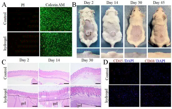 LF hydrogel shows high biocompatibility and biodegradability in vitro and in vivo. (A) Calcein-AM/PI fluorescence images of cells simultaneously stained with Calcein AM dye and propidium iodide (PI) for staining live and dead cells, respectively. (B) Macroscopic photographs of LF hydrogel implanted in subcutaneous tissue at different times. (C) H&E staining of LF hydrogel adjacent to skin tissues at 2, 7, and 30 days after subcutaneous implantation. (D) Immunofluorescence of LF hydrogel using CD45 and CD68 adjacent to skin tissues after 30 days of implantation.
