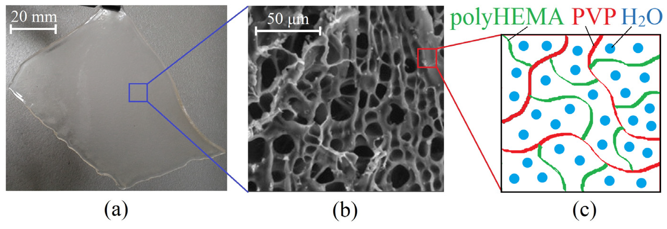 - Seo, E.; Kumar, S.; Lee, J.; Jang, J.; Park, J.H.; Chang, M.C.; Kwon, I.; Lee, J.S.; Huh, Y.I. Modified hydrogels based on poly(2-hydroxyethyl methacrylate) (pHEMA) with higher surface wettability and mechanical properties. Macromol. Res. 2017, 25, 704–711. [Google Scholar] [CrossRef]
