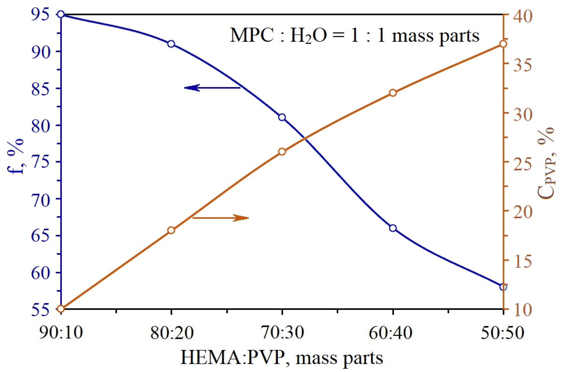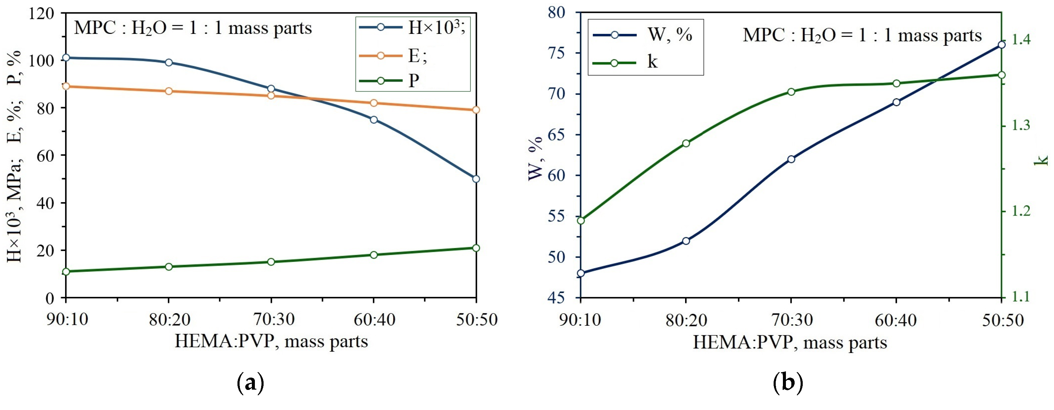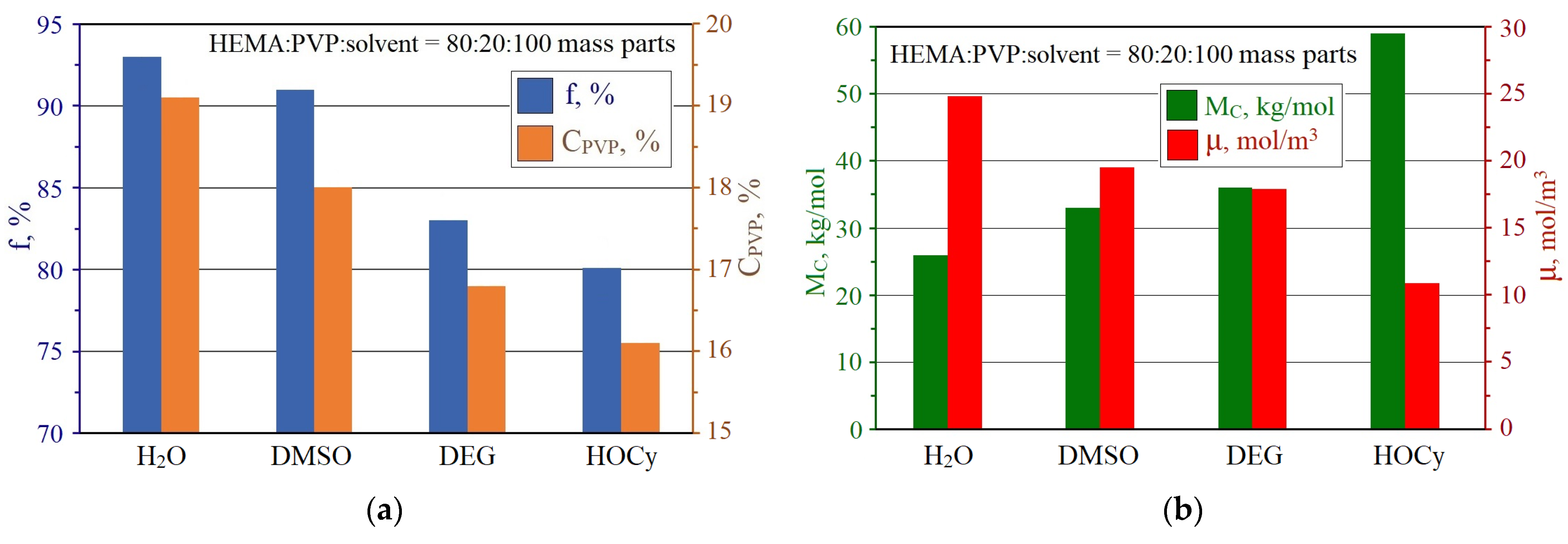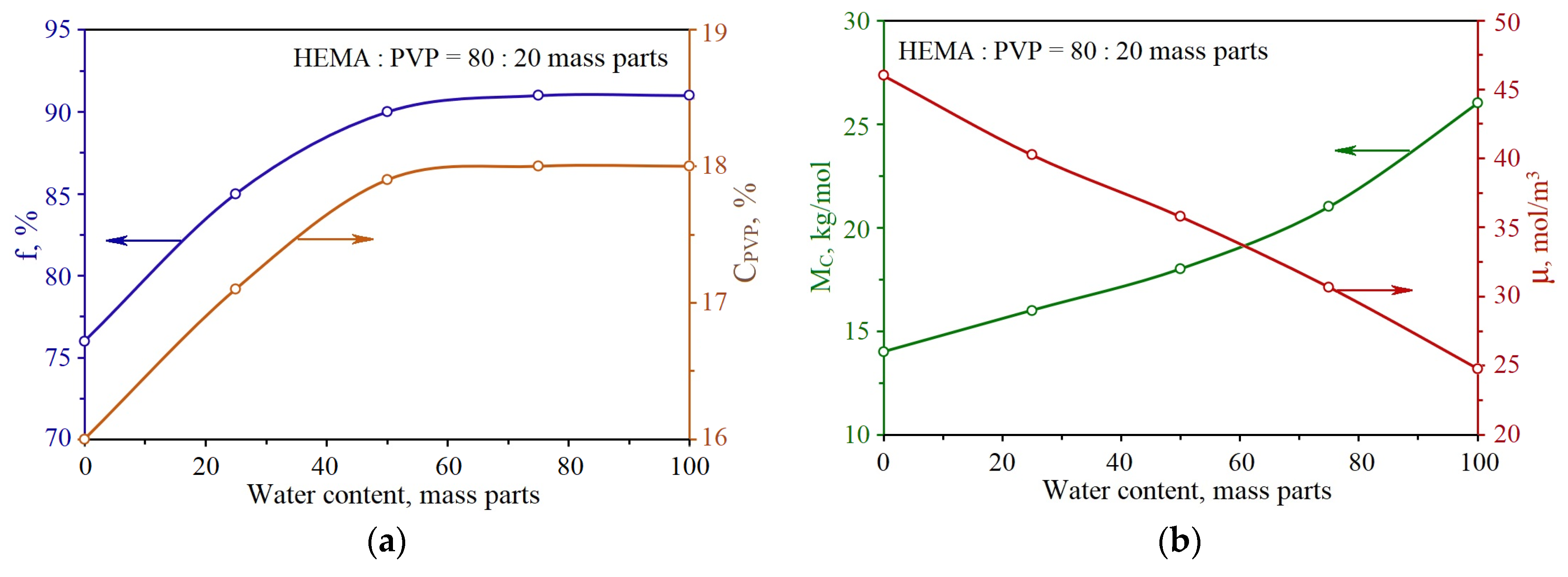 | № | HEMA | PVP | E, kgf/cm2 | MC, kg/mol | ρ, kg/m3 | μ, mol/m3 |