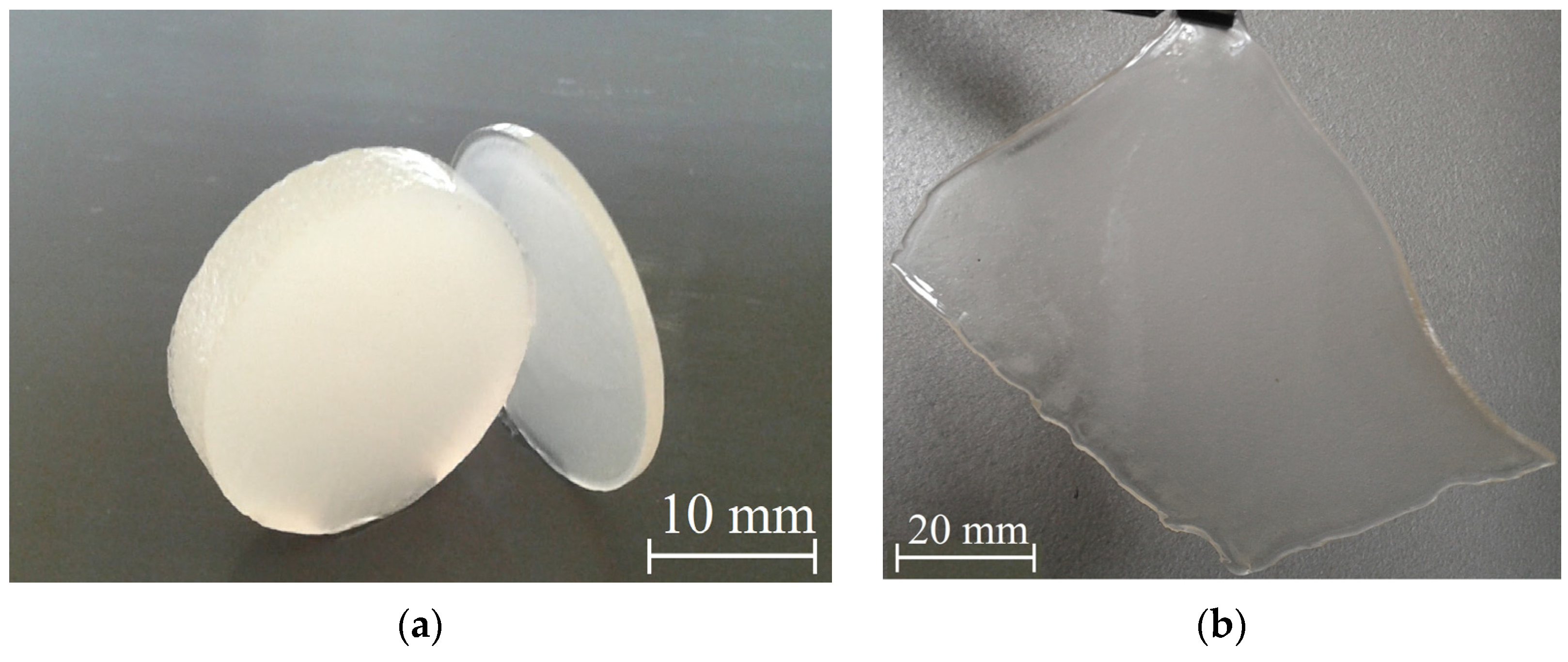 - Hussein, D.J.; Satar, M.; Al-Hamzawi, A.K.; Shabbani, H.; Mutar, M.A.; Othman, M.R. Photopolymerization of hydrogel using three types of cross-linking agents: Effects of water content, mechanical and thermal properties. S. Afr. J. Chem. Eng. 2025, 53, 400–409. [Google Scholar] [CrossRef]